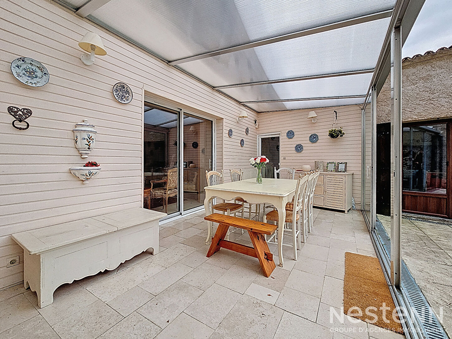 Le salon se prolonge sur une véranda chauffée de 20 m², véritable pièce de vie supplémentaire ouverte sur le jardin. S'ajoutent une cuisine équipée, une grande pièce de réception avec bar, une buanderie et un WC indépendant. La configuration permet de vivre de plain-pied.