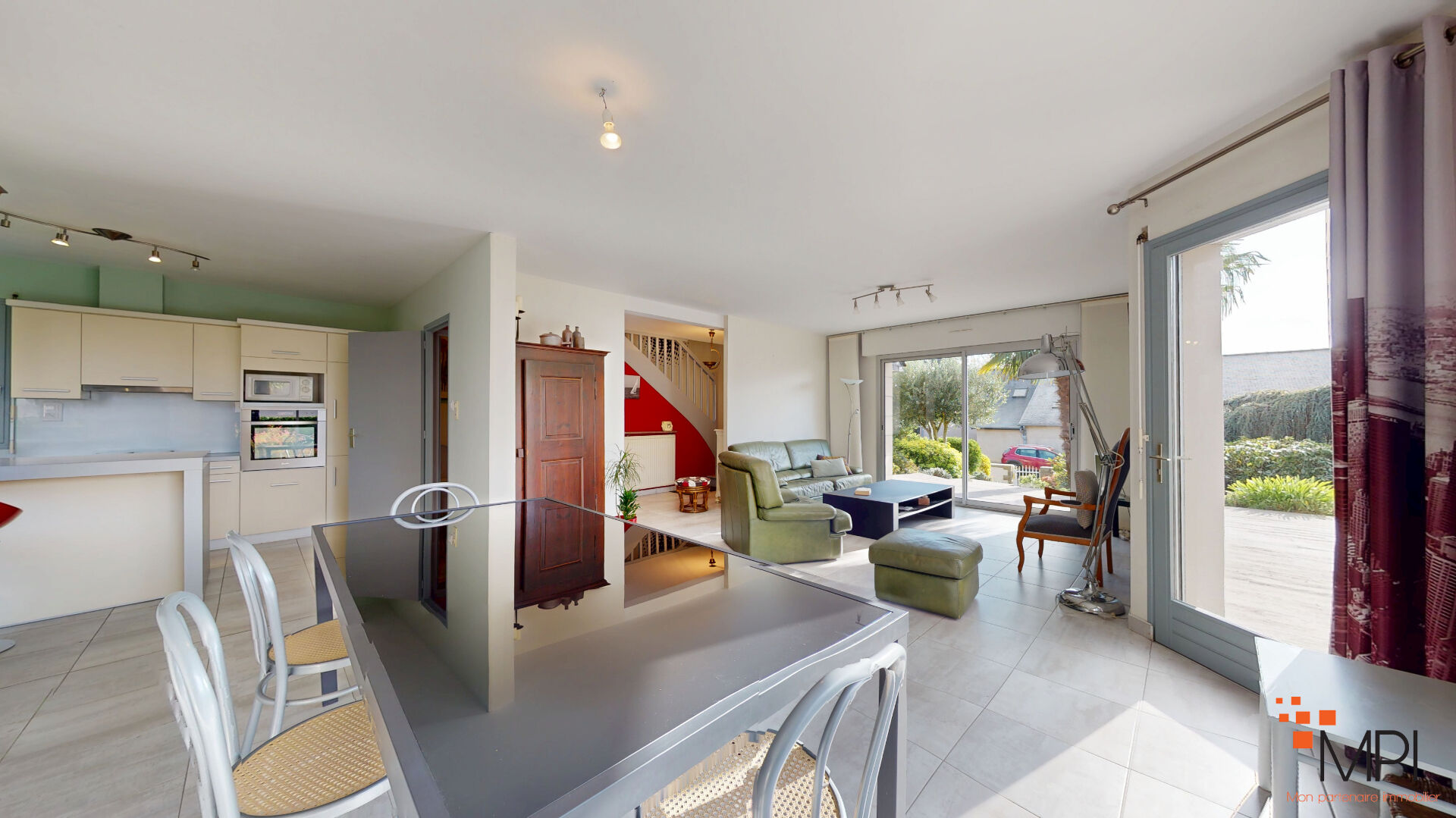L'entrée indépendante donne accès au salon-séjour exposé sud-ouest avec la possibilité d'y installer une cheminée. Une cuisine ouverte d'environ 11 m² communique directement avec la pièce de vie.