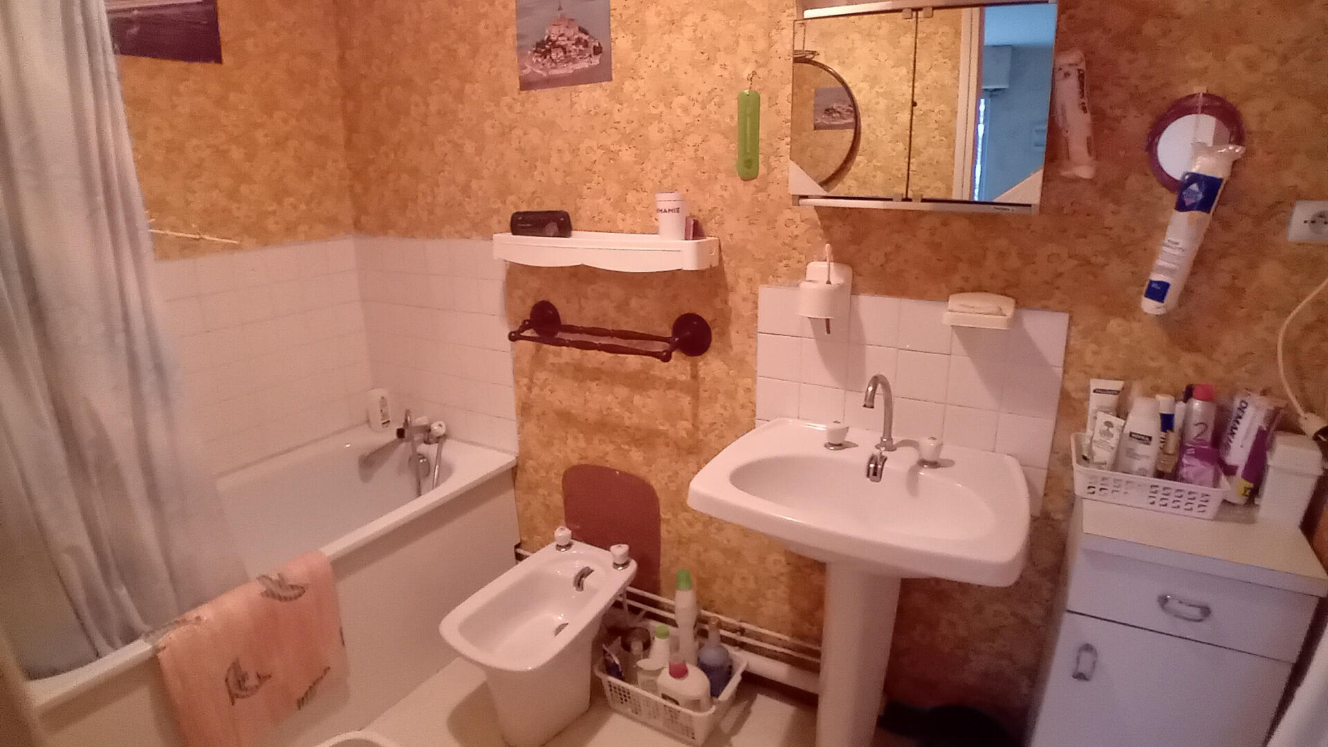 entrée, séjour avec balcon, cuisine séparée, chambre avec salle bain privative, cellier, WC.
