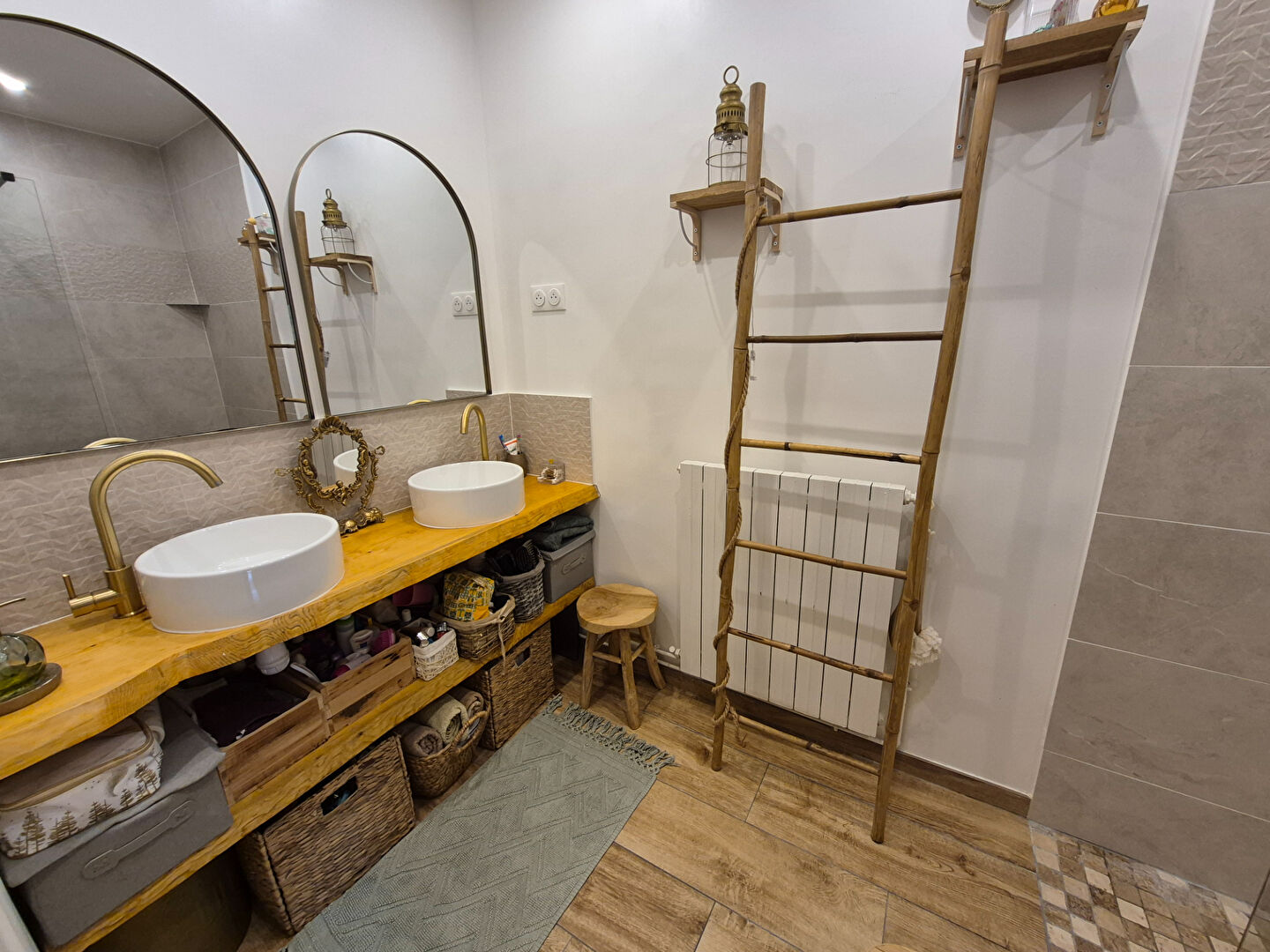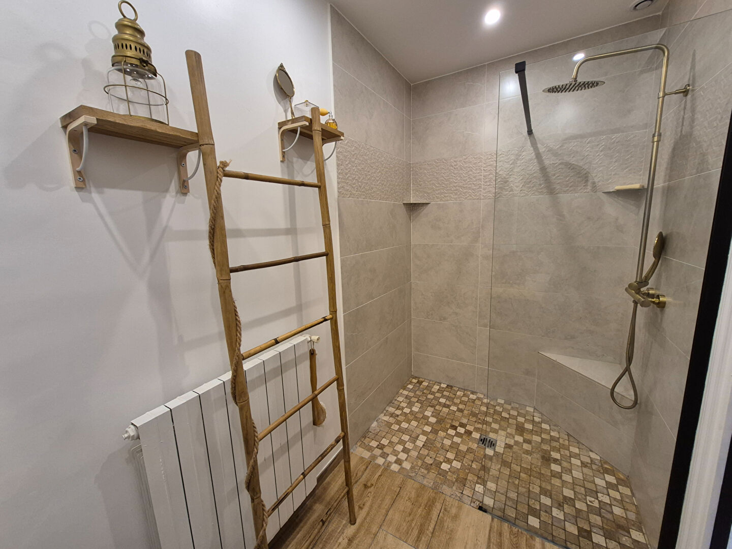 Dans son prolongement, vous trouverez une cuisine moderne entièrement équipée. Pour un confort optimal, une salle de bain avec douche, double vasque et des toilettes séparés se trouve au Rez-de-Chaussée.