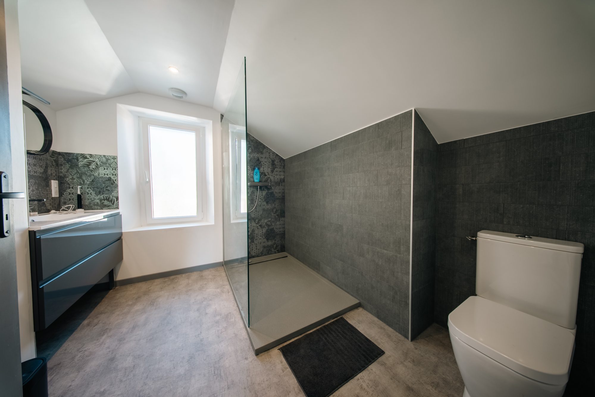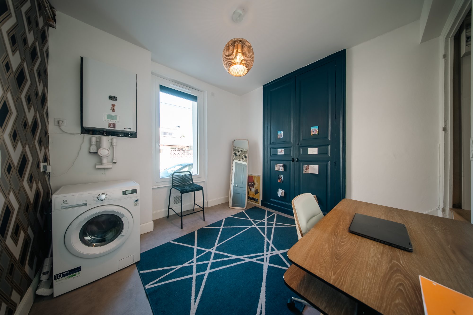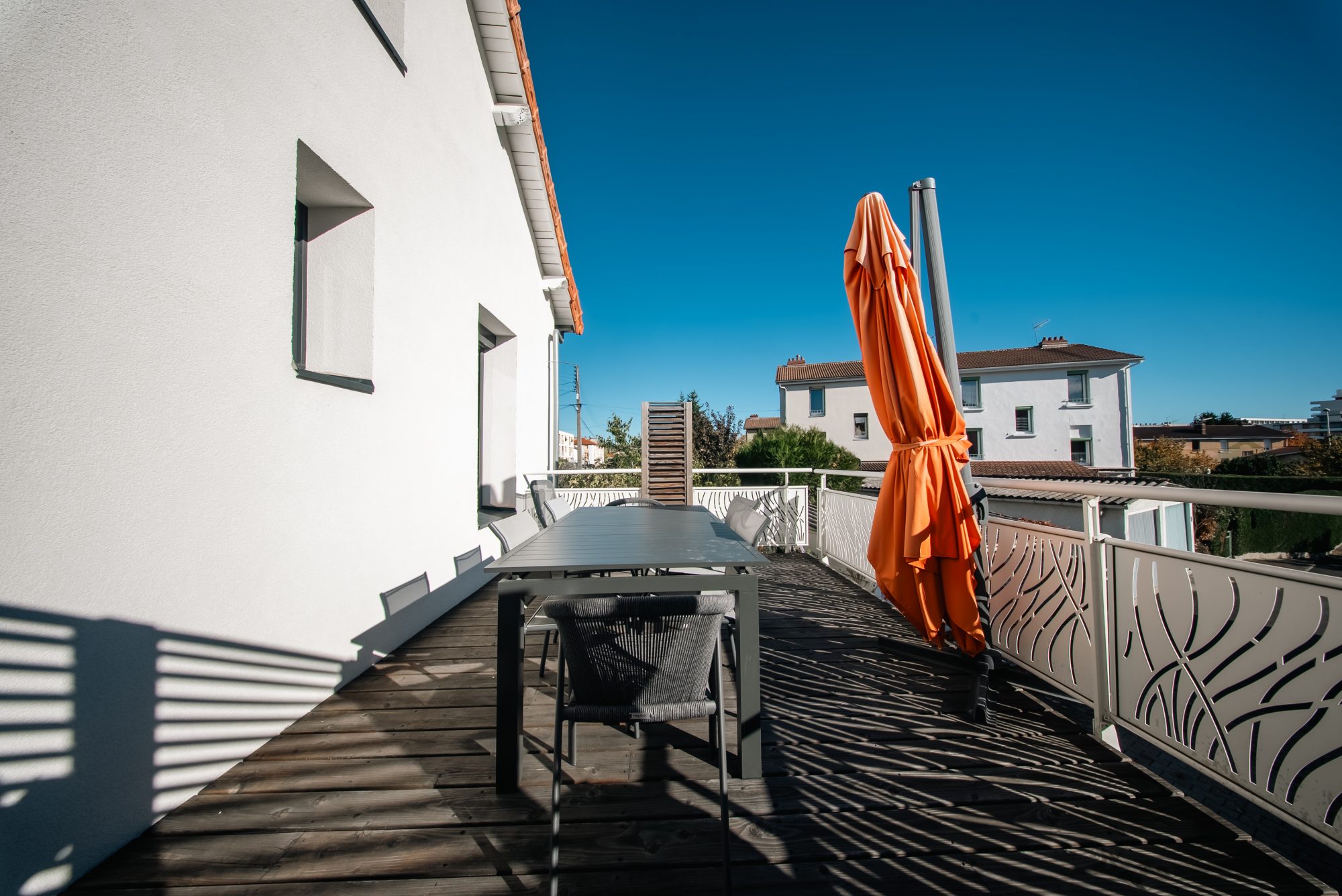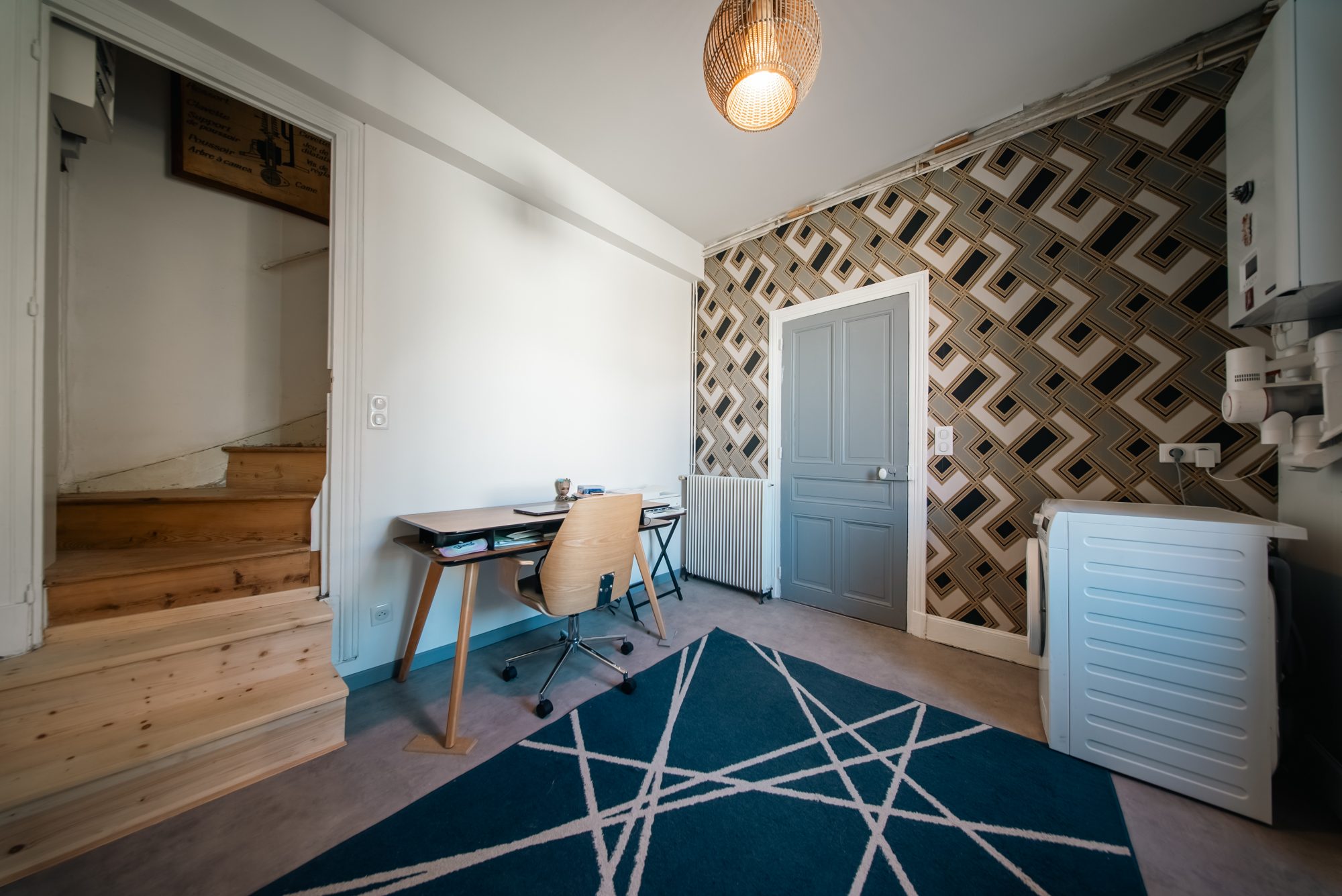 - Rez-de-chausée : une double pièce de vie avec une cuisine aménagée et équipée ouverte donnant accès à la terrasse, une chambre, un bureau et un WC indépendant.