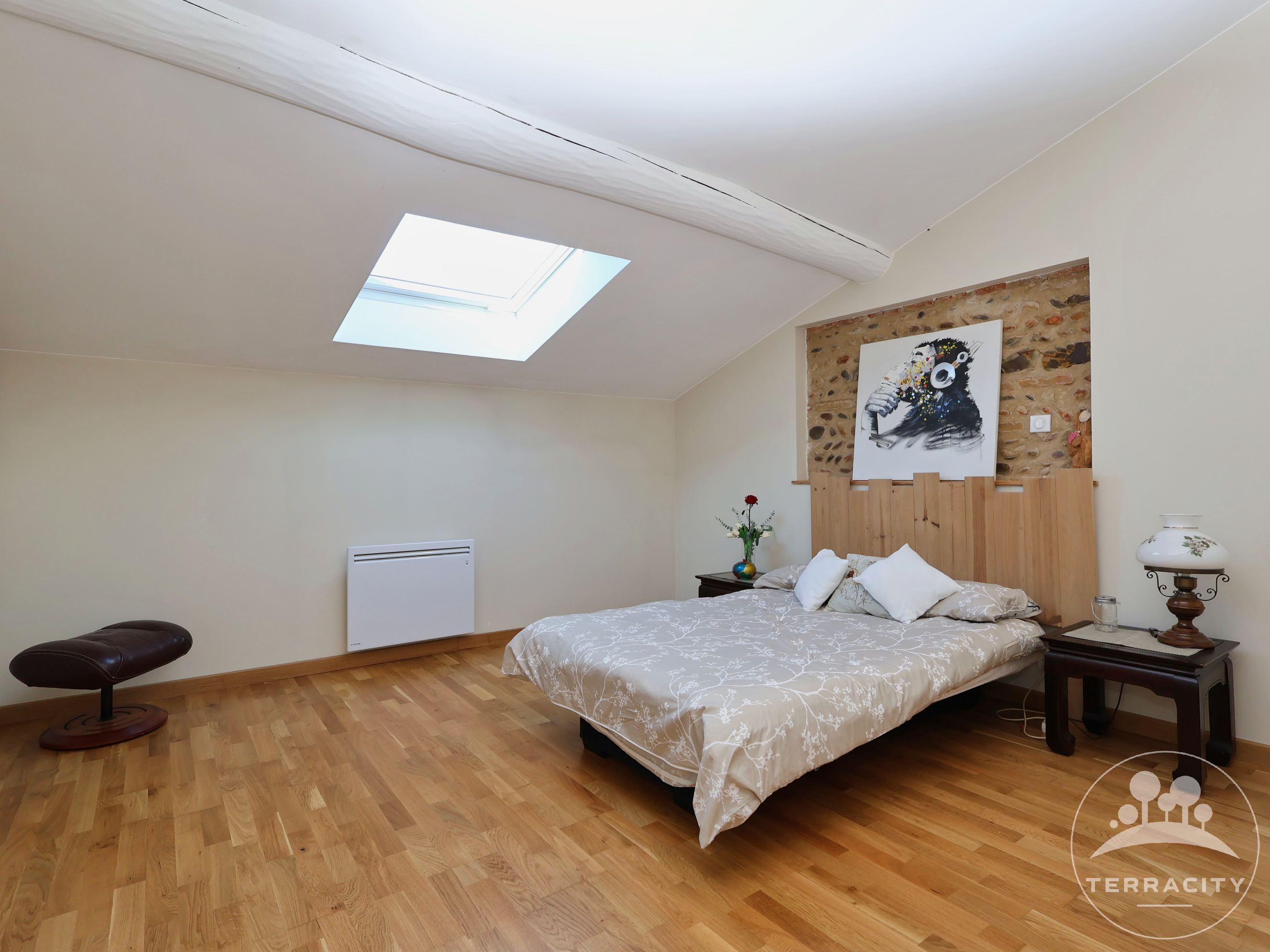 • Un vaste séjour/cuisine de 65 m², sublimé par ses poutres apparentes et ses murs en pierre