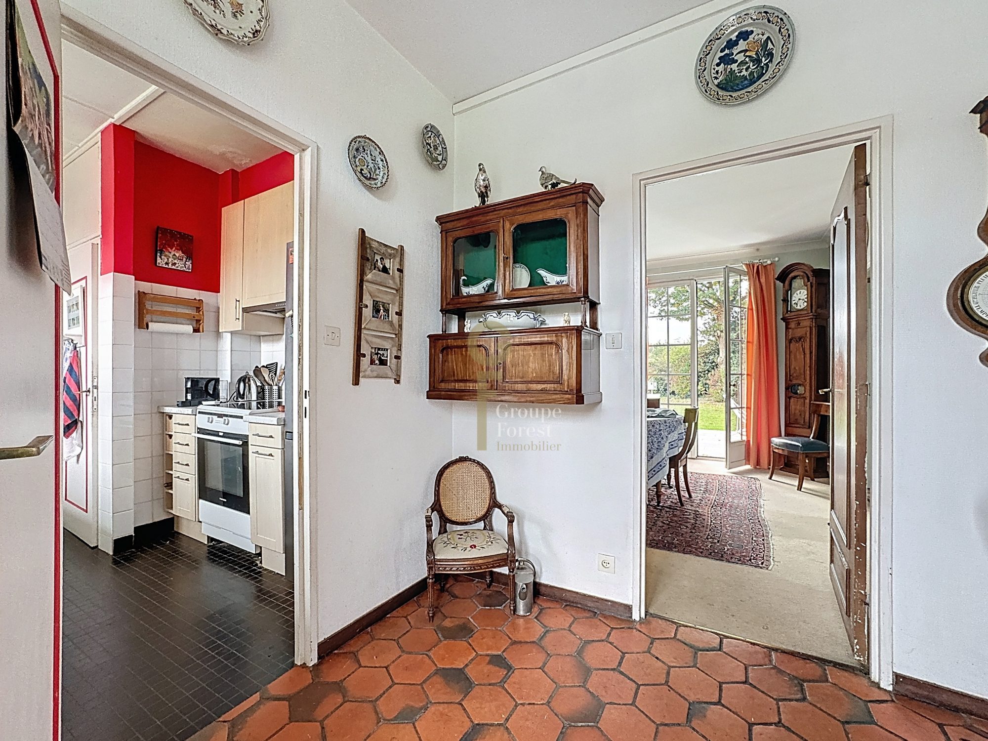 Cuisine équipée et cellier , bureau sur jardin .