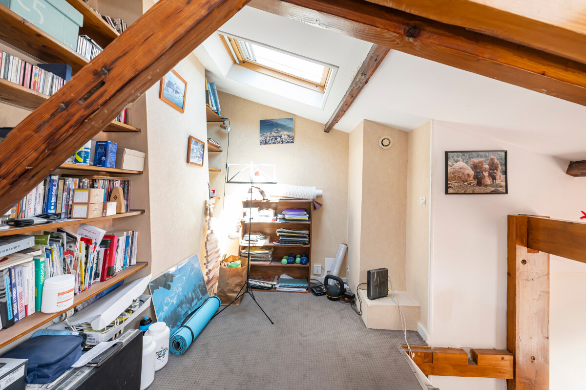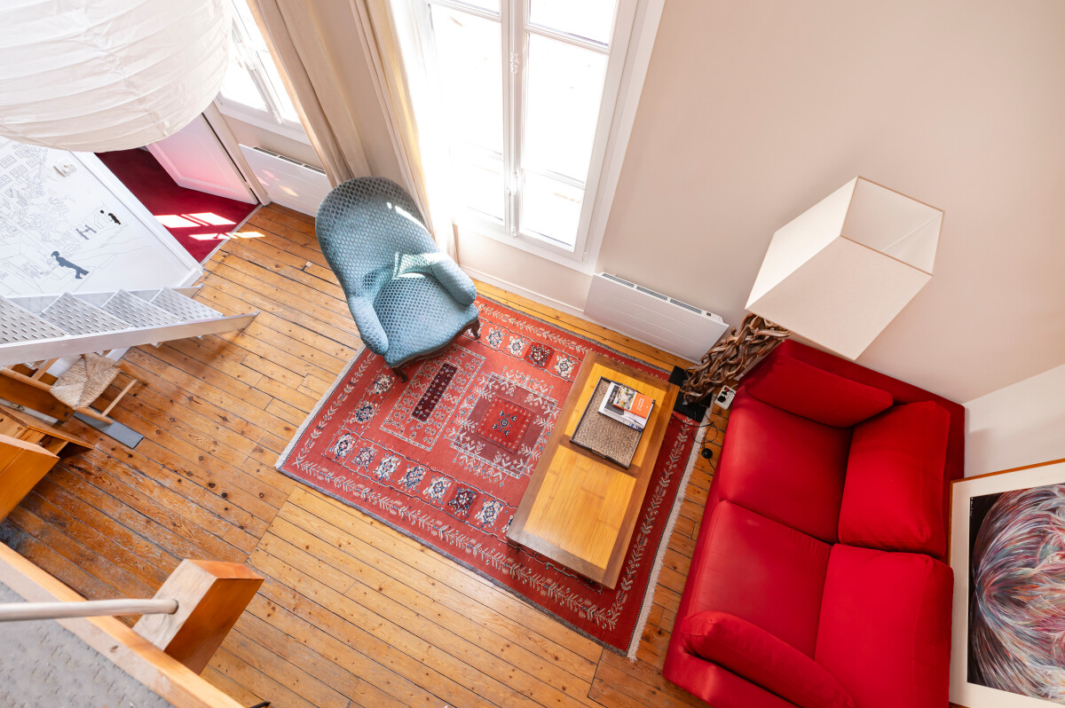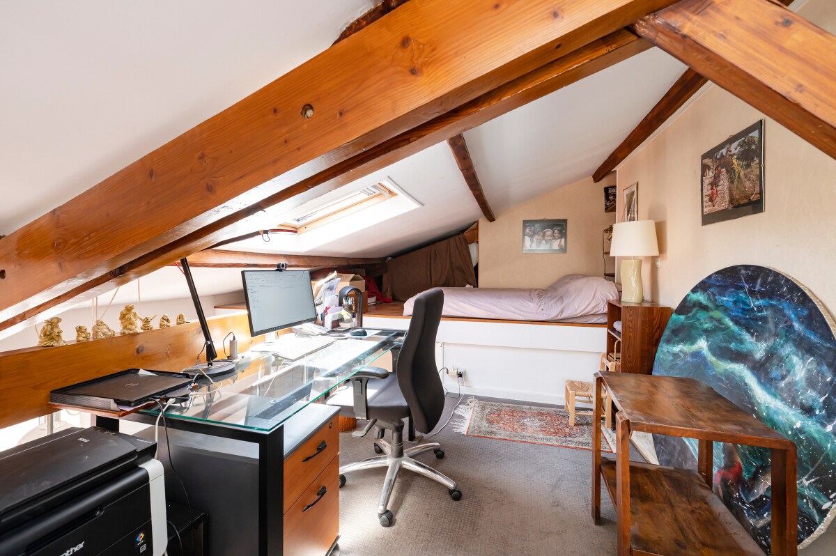 D'une surface pondérée de 49 m² (63,42 m² au sol - 41,11 m² Carrez), il se compose d'un séjour lumineux de 22 m² exposé plein sud, bénéficiant d'une belle hauteur sous plafond, de poutres apparentes et de deux grandes fenêtres, d'une petite cuisine ouverte, d'une chambre en duplex avec mezzanine, ainsi que d'une seconde mezzanine au-dessus du séjour, aménagée en bureau ou chambre d'appoint. Enfin, une salle de bains avec WC. Une cave et un emplacement vélos dans la cour complètent le bien.