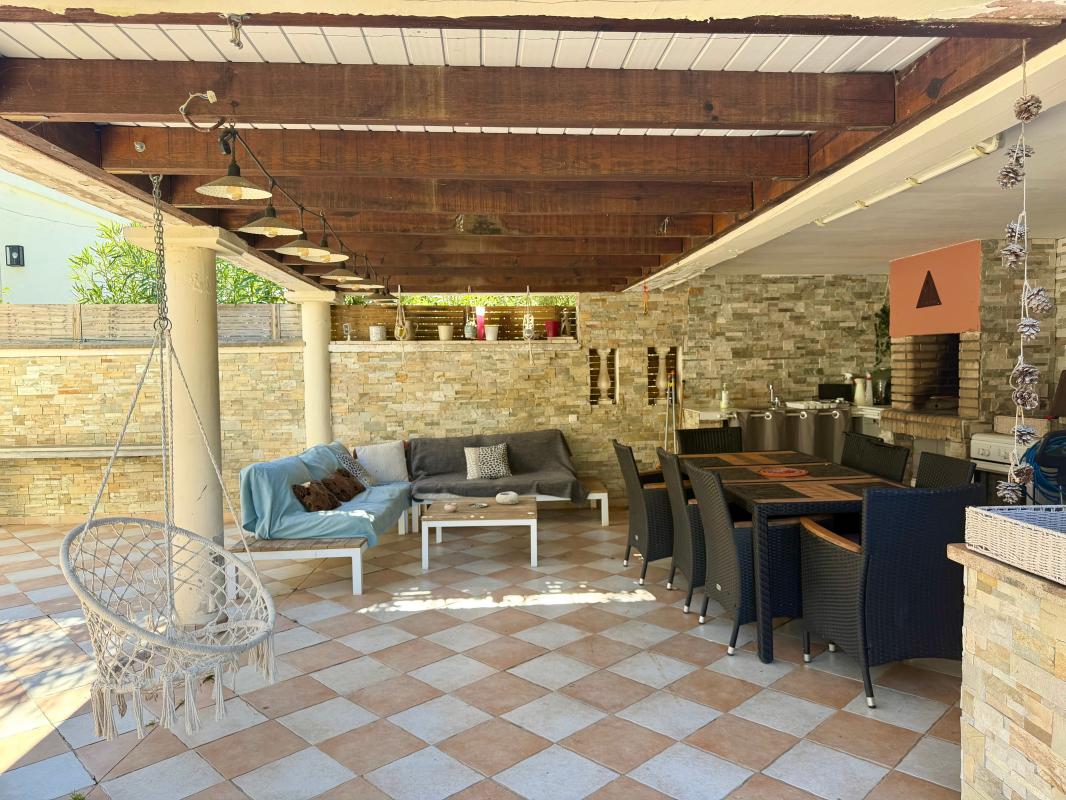 Côté extérieur, une grande terrasse, un carport, et une superbe piscine au sel 10x4 installée en 2022, sécurisée par volet roulant et alarme. La cuisine d'été couverte, agrémentée de murs en pierre, offre un véritable espace de vie extérieur l'été, intime et chaleureux.