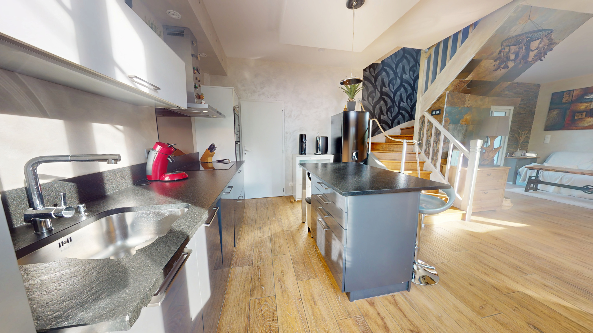 Elle se compose au rez-de-chaussée d'une pièce de vies lumineuse avec cuisine aménagée et équipée, chambre, garage et buanderie/cave.