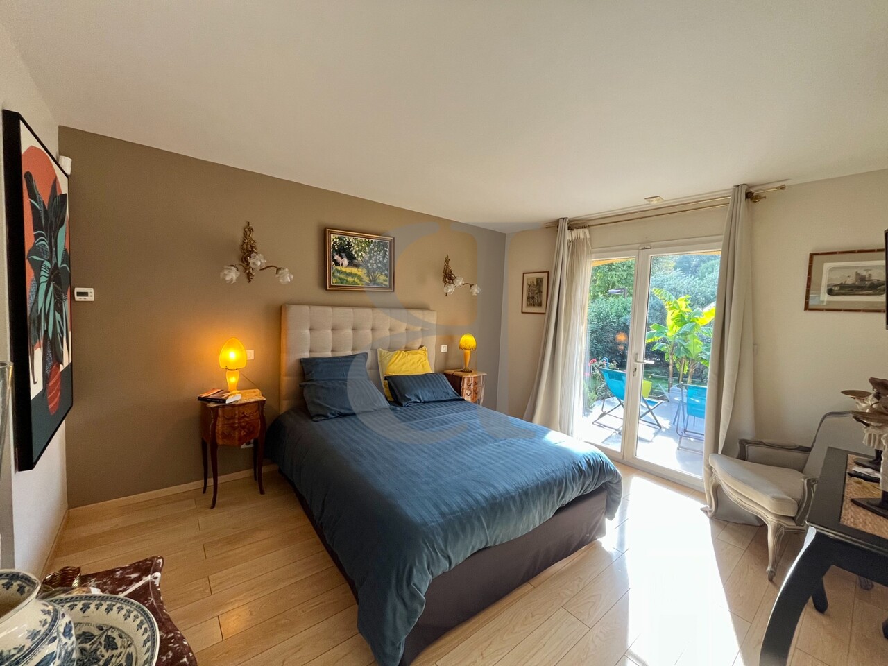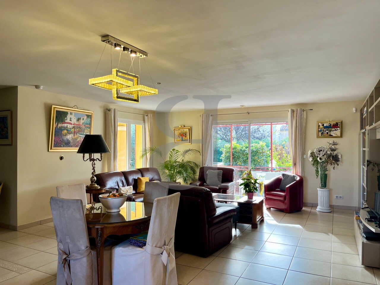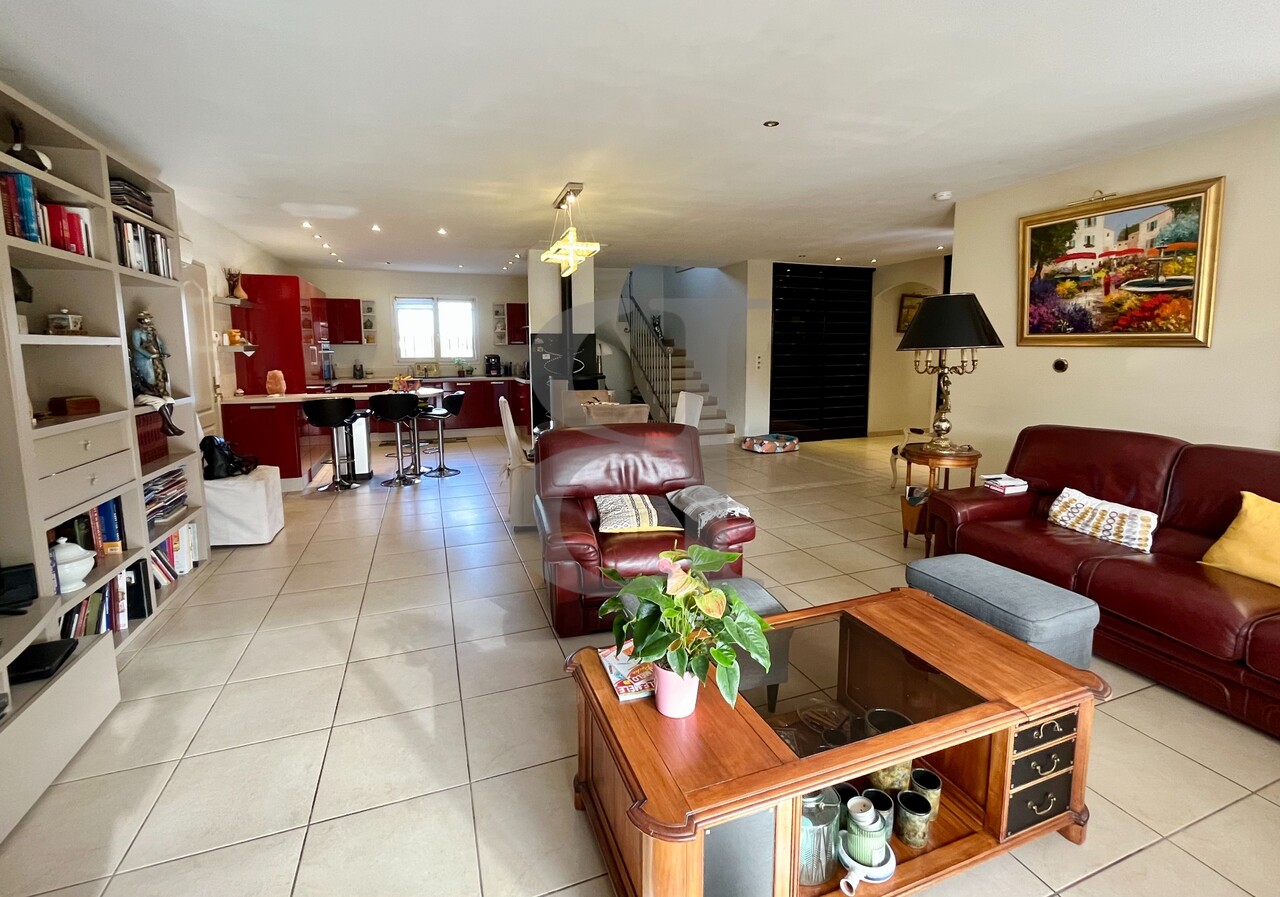 La pièce de vie principale, spacieuse et ouverte sur le jardin, offre un bel espace de réception où la cuisine, la salle à manger et le salon se prolongent naturellement vers l’extérieur.