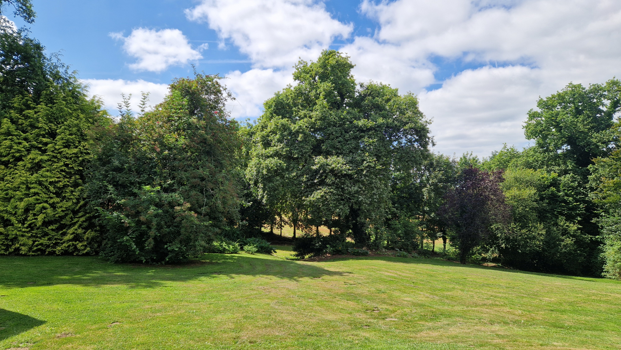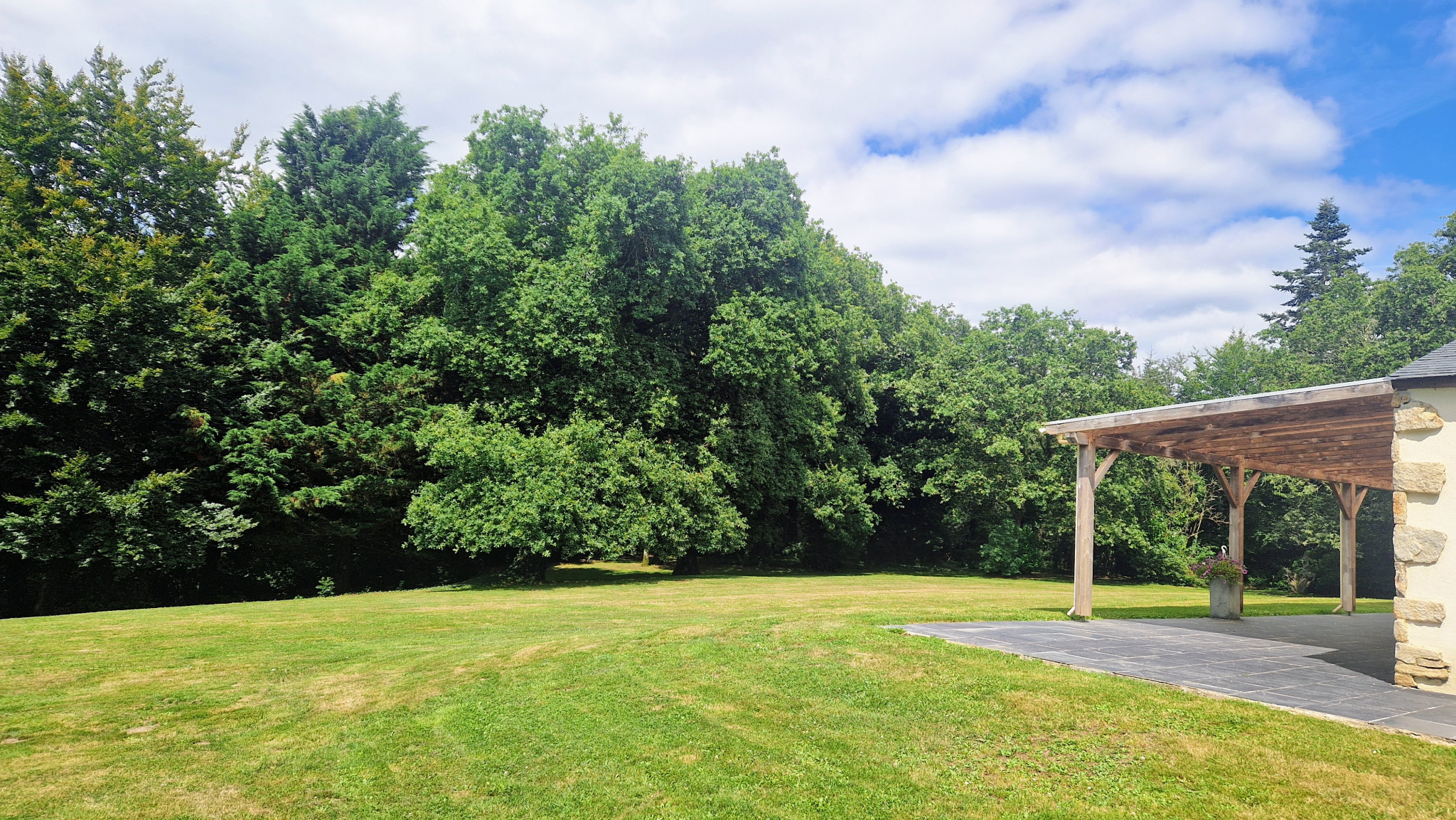 Grande terrasse couverte, parc verdoyant et bois, le tout sur un terrain arboré de plus de 2 hectares, sans vis-à-vis, offrant un cadre intime et enchanteur pour les réceptions.