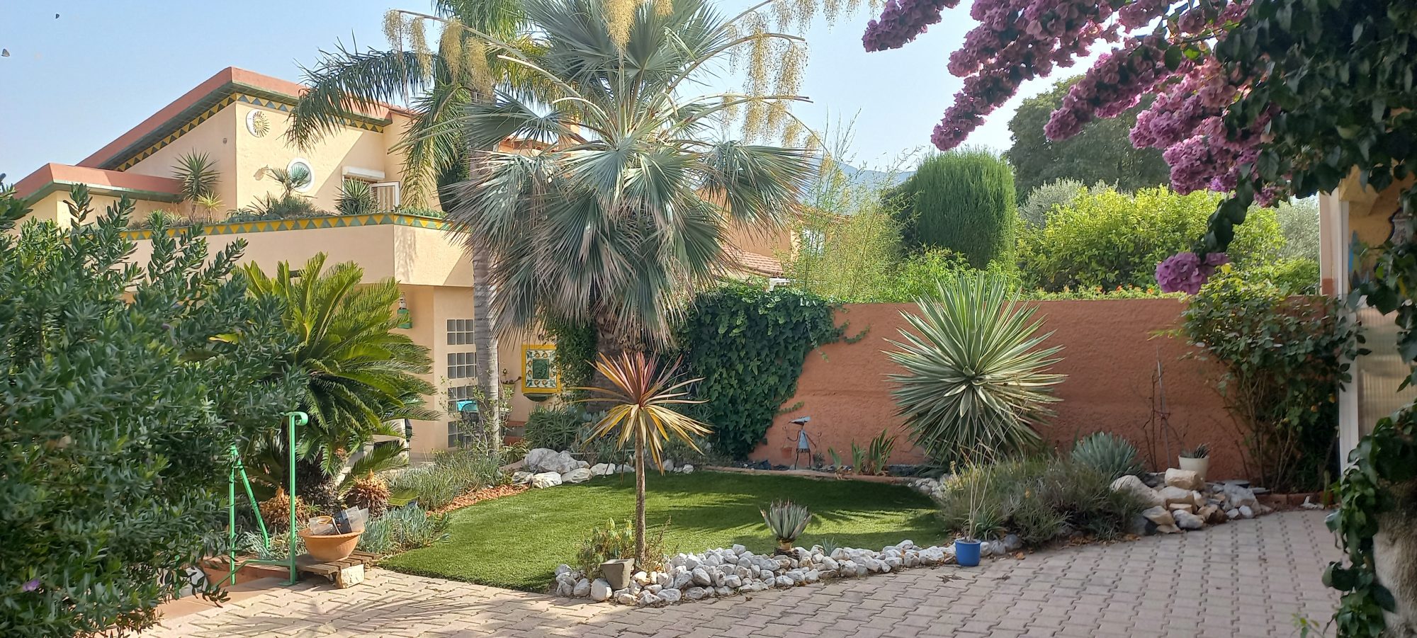 Dès l'entrée, le ton est donné : on découvre une belle pièce de vie aux volumes généreux? et, irrésistiblement, le regard est happé par la baie vitrée. De l'autre côté, un jardin superbement entretenu s'offre à vous, avec sa piscine scintillante, sa terrasse ensoleillée et son ambiance de vacances toute l'année.