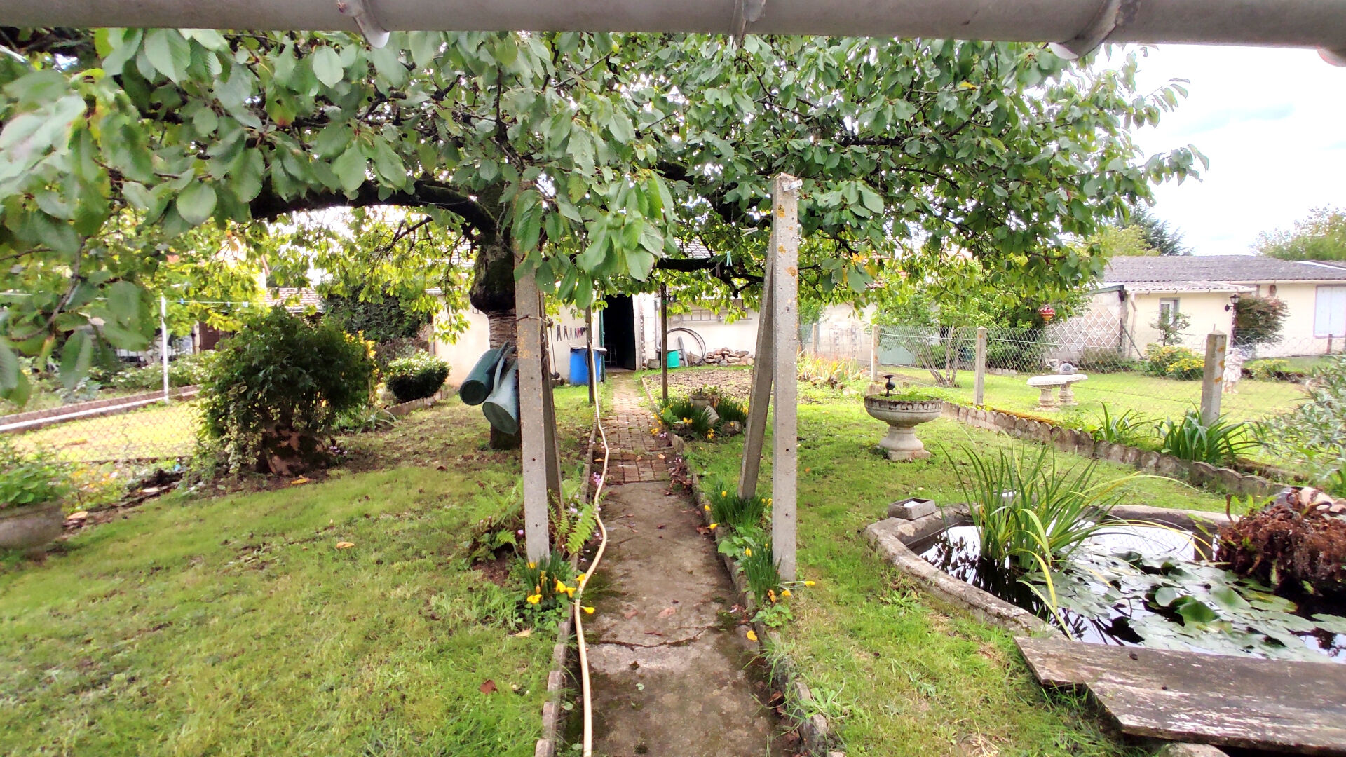 Jardin clos avec accès piéton, abri, atelier, débarras, cave voutée.