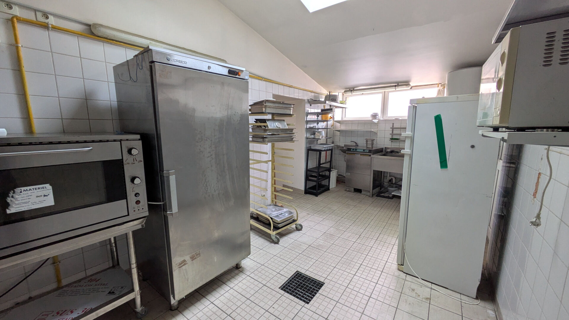 -en rdc un local commercial en bon état, exploité en restaurant avec cuisine, bar, vaste salle, wc avec accès PMR, annexes pour un total de 107 m2 exploitables, accessibles depuis la place et la rue.