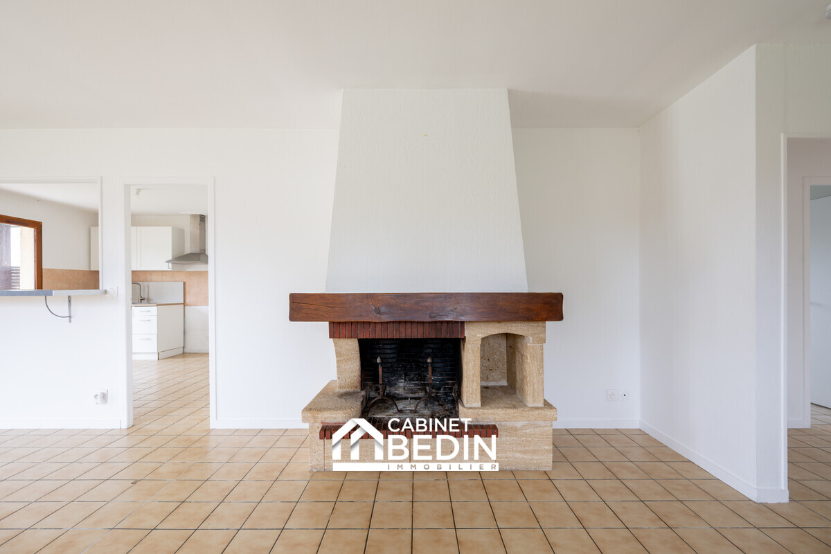 Sa pièce de vie lumineuse de près de 50 m², incluant une cuisine semi-ouverte, invite à la convivialité autour de la cheminée.