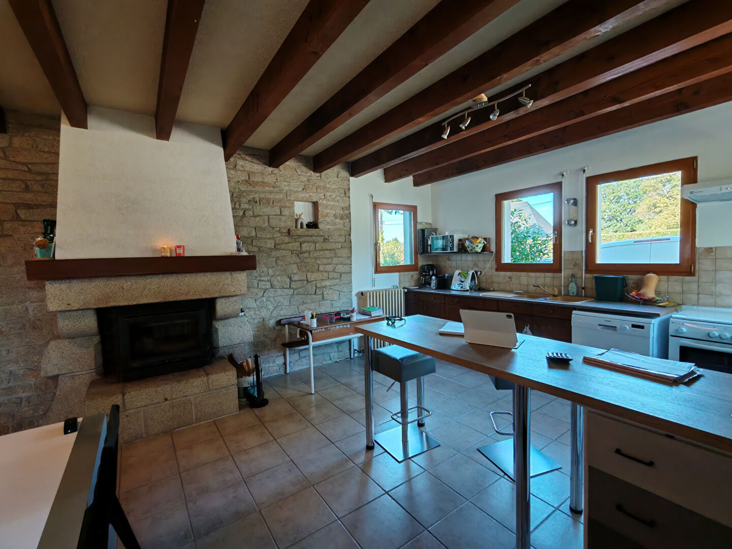 Elle se compose d'une pièce de vie chaleureuse avec cuisine aménagée ouverte et un coin salon mêlant charme de l'ancien et rénovation avec goût.