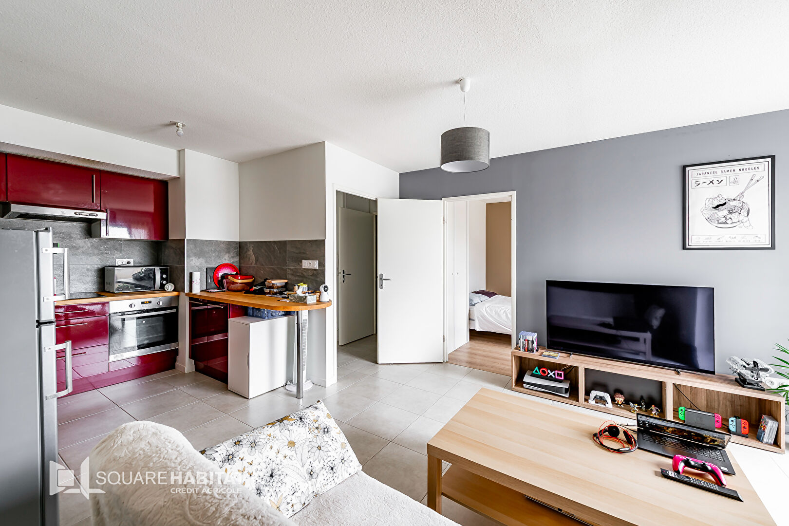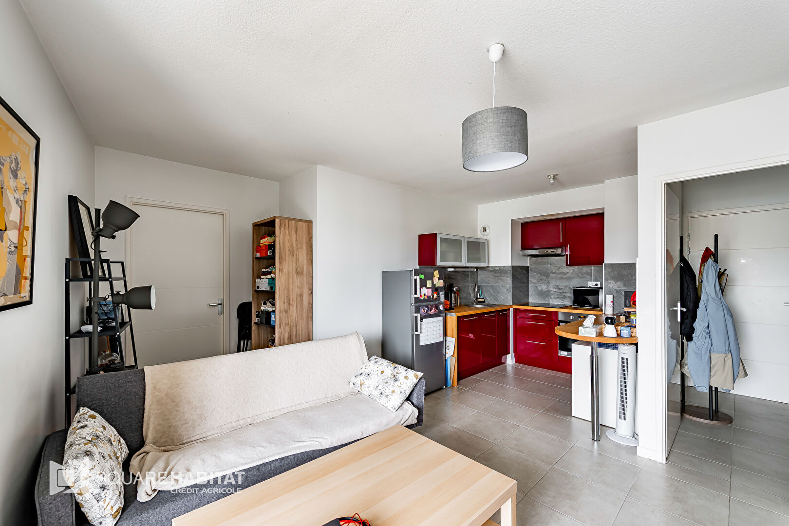 Entrée avec placards qui dessert une spacieuse pièce de vie avec une cuisine aménagée et équipée (hotte, plaque, four), cellier/buanderie, chambre avec placard.