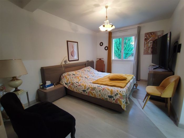 Une double garage avec accès direct de plain-pied et un abri de jardin viennent compléter ce bien.