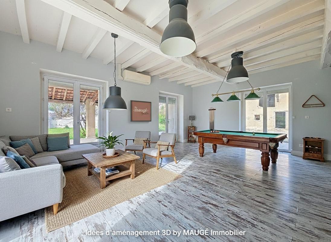 - Salon avec cheminée à foyer ouvert pour profiter des soirées d'hiver au coin du feu, possibilité de rajouter un billard ou un baby foot ou un coin bureau : 30,32m²