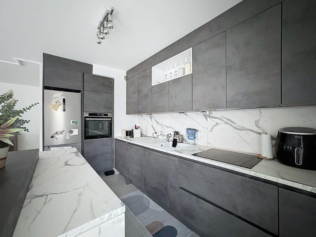 Cuisine contemporaine ouverte, entièrement aménagée et équipée.