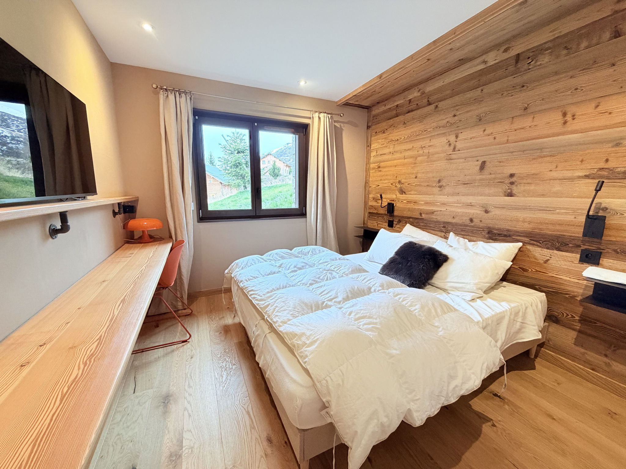 La pièce maîtresse de 64 m2 séduit par son charme montagnard revisité, une charpente apparente majestueuse, un salon convivial avec poêle suspendu, et de larges baies vitrées ouvertes sur une terrasse panoramique. La cuisine ouverte, réalisée sur mesure, allie design et fonctionnalité autour d'un ilot central convivial. Le chalet compte 7 chambres, dont 6 suites parentales, chacune disposant de sa salle d'eau privative.