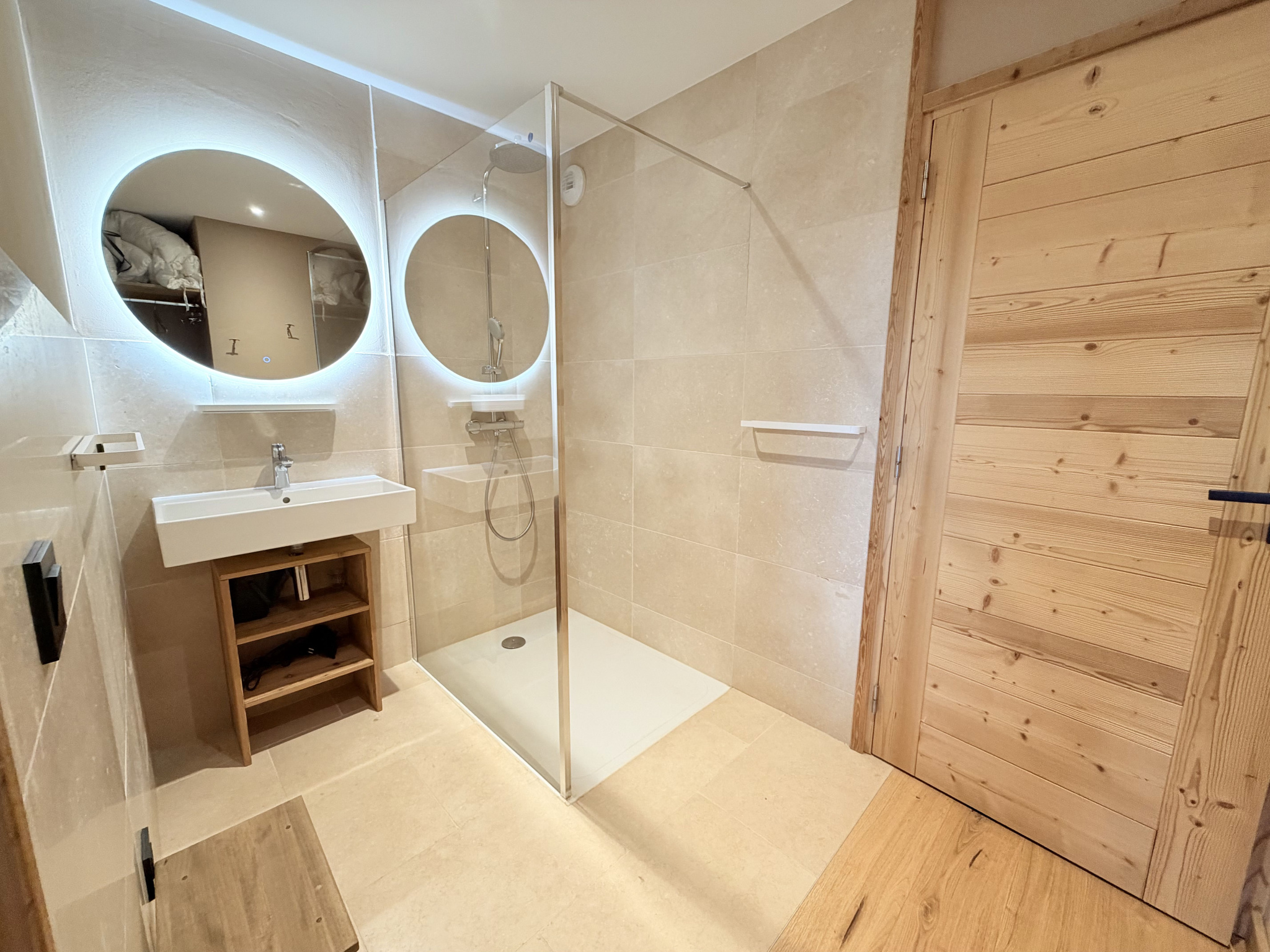 La suite principale est un véritable cocon, dotée d'une grande baignoire, d'une douche italienne et d'une vue spectaculaire sur les montagnes. Un dortoir sur mesure complète l'espace nuit, idéal pour accueillir famille et amis dans un confort absolu.