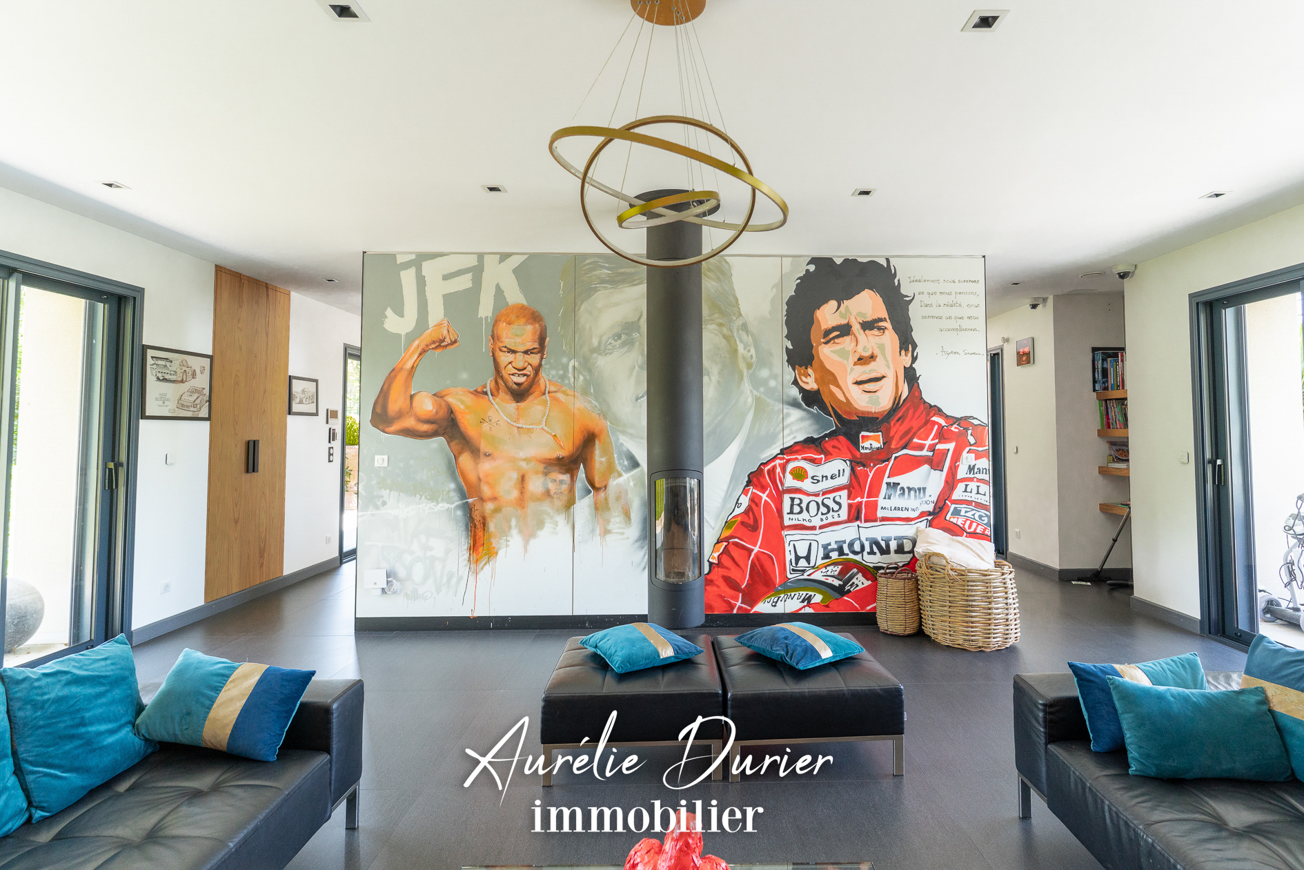 Dès l'entrée, vous serez séduit par l'ambiance à la fois chaleureuse et contemporaine de cette maison hors du temps. Le vaste séjour baignée de lumières avec ses immenses baies vitrées vue sur la terrasse exposée Sud et la vue imprenable et dégagée sur la piscine. La cuisine aménagée et équipée devient le coeur fonctionnel et convivial de la maison. Une buanderie et une cave à vins complètent les espaces pratiques du rez-de-chaussée.