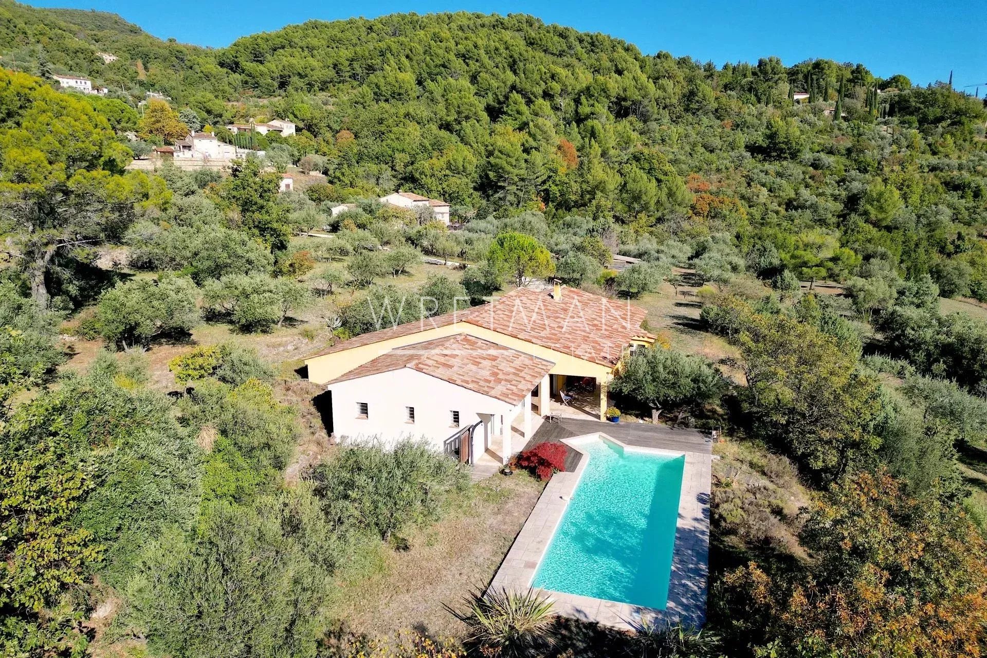 A seulement 5 minutes à pied du village de Seillans, belle villa contemporaine de plain pied de 150 m² avec un jardin provençal de 6400 m² avec de nombreux oliviers. Au calme absolu et avec une vue magnifique.