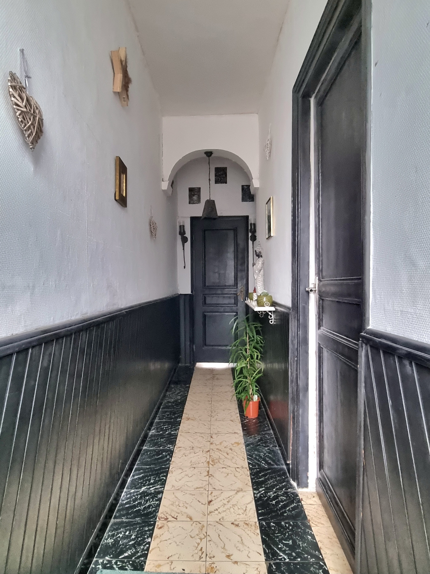 Dotée d'une double distribution, avec d'un côté l'habitation principale et de l'autre, dans une rue parallèle, un garage avec passage latéral, ce bien peut vous offrir de multiples possibilités. Il dispose au rez-de-chaussée d'un couloir d'entrée, d'une salle à manger avec belle hauteur sous plafond de 15m2, d'un salon de 13 m2, d'une cuisine non équipée et d'une buanderie avec WC. Vous trouverez également une pièce d'environ 5 m2 actuellement non utilisée pouvant faire office de dressing ou encore être utlisée dans le but d'agrandir l'espace salon.