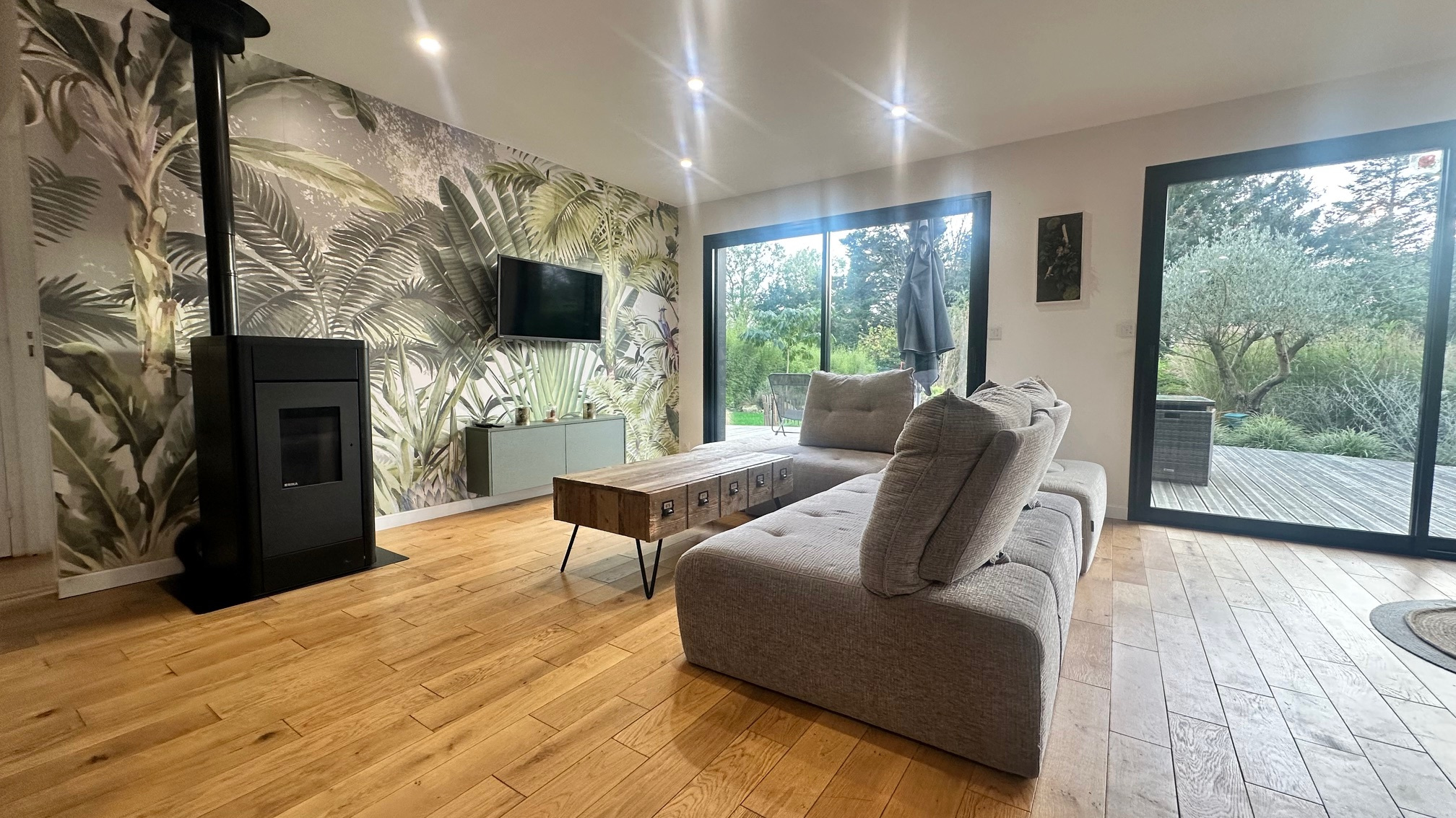 Pièce de vie lumineuse chauffée par un poêle à pellets, ouvrant sur une terrasse de 50 m2