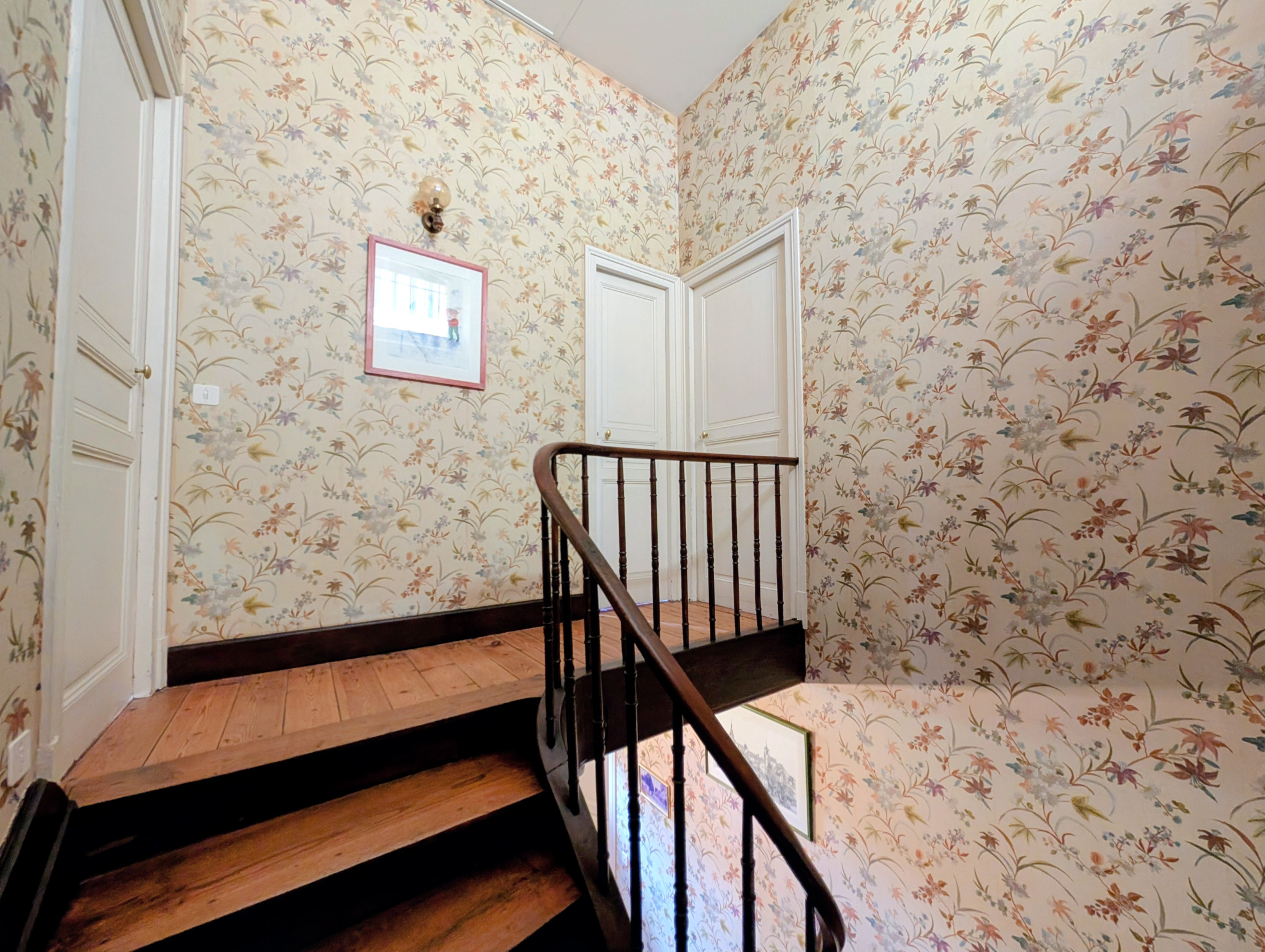 Dès l'entrée, le magnifique escalier d'époque donne le ton du charme authentique de cette demeure, qui séduit par ses beaux volumes et son cachet préservé. De part et d'autre, deux chambres spacieuses, dont une avec salle de bain. L'espace de vie comprend un séjour lumineux avec cheminée et une cuisine séparée, idéale pour la vie de famille.