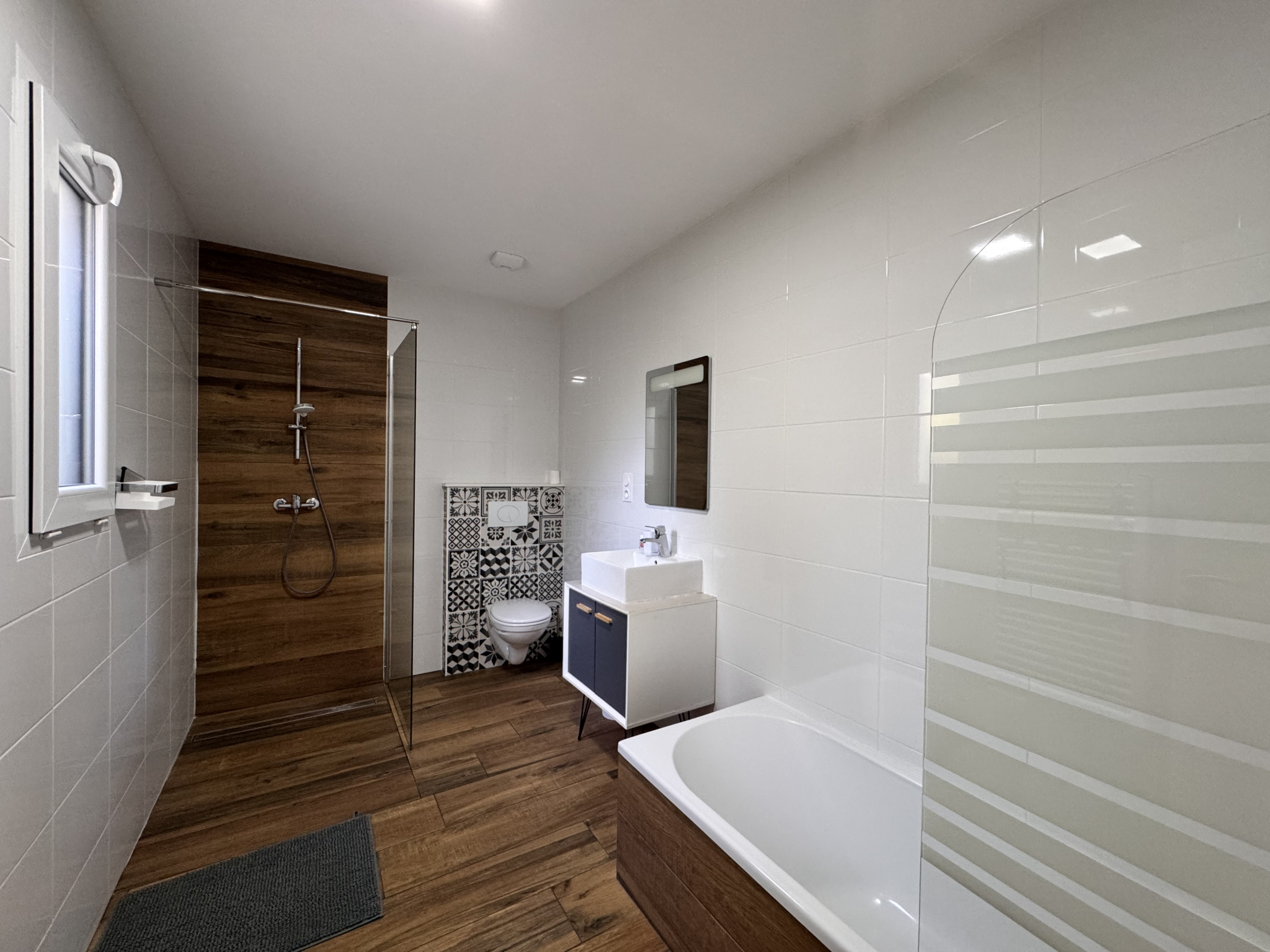 Cette maison de plain-pied de 225 m2 se distingue par son design innovant en U, unissant deux ailes par une superbe verrière ouvrant sur un patio central, créant ainsi une atmosphère d'espace et de lumière. Les vastes espaces de vie de 115 m2 comprennent une cuisine moderne, une salle à manger conviviale et un salon baigné de lumière.