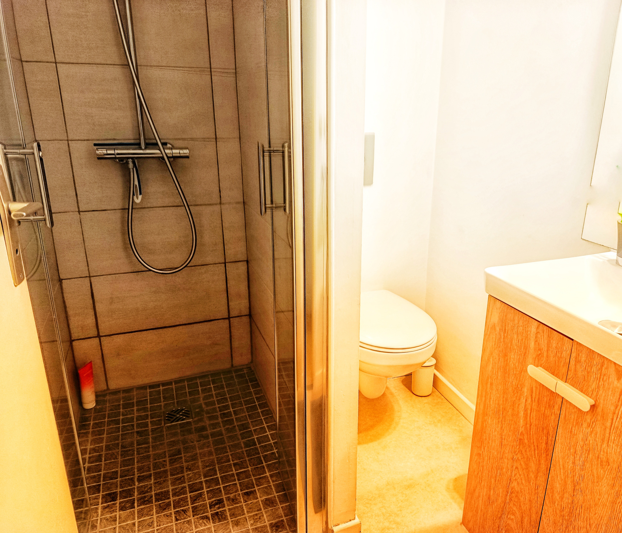 Un séjour lumineux avec kitchenette équipée, une spacieuse chambre avec rangements et une salle d'eau avec WC