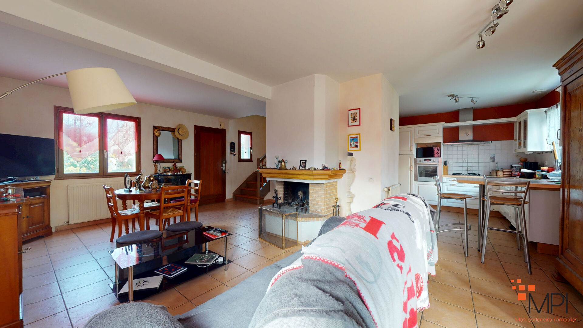 D'une surface d'environ 94 m², la maison est édifiée sur un sous-sol complet et se compose, au premier niveau, d'un lumineux salon-séjour, réchauffé par sa cheminée et donnant accès à une agréable véranda.