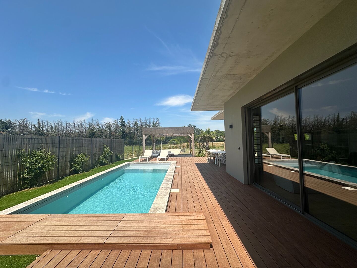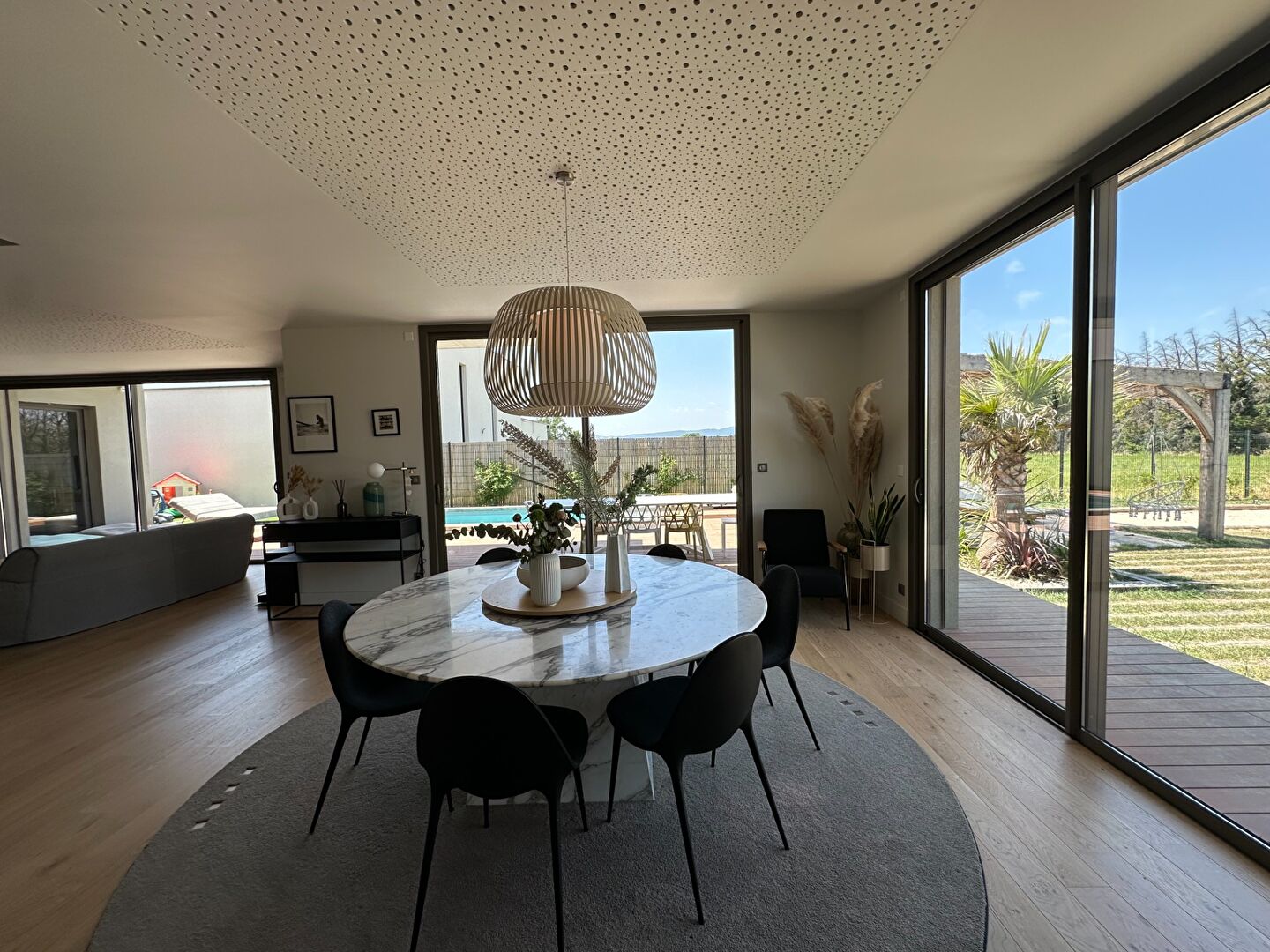 Belle Villa de 2022 d'environ 193 m² habitable sur un beau terrain clos de 816 m². Elle se compose au Rdc d'une grande et lumineuse pièce à vivre de 80 m² comprenant cuisine équipée, salle à manger et séjour. Vous retrouverez également une grande suite parentale avec chambre, dressing aménagé et SDE. A l'étage , 3 chambres et une SDB. Pour finir, la piscine, terrasse , terrain de pétanque ainsi la buanderie et le garage viennent compléter ce bien de qualité. Belles prestations pour ce bien situé dans un quartier recherché. Produit rare