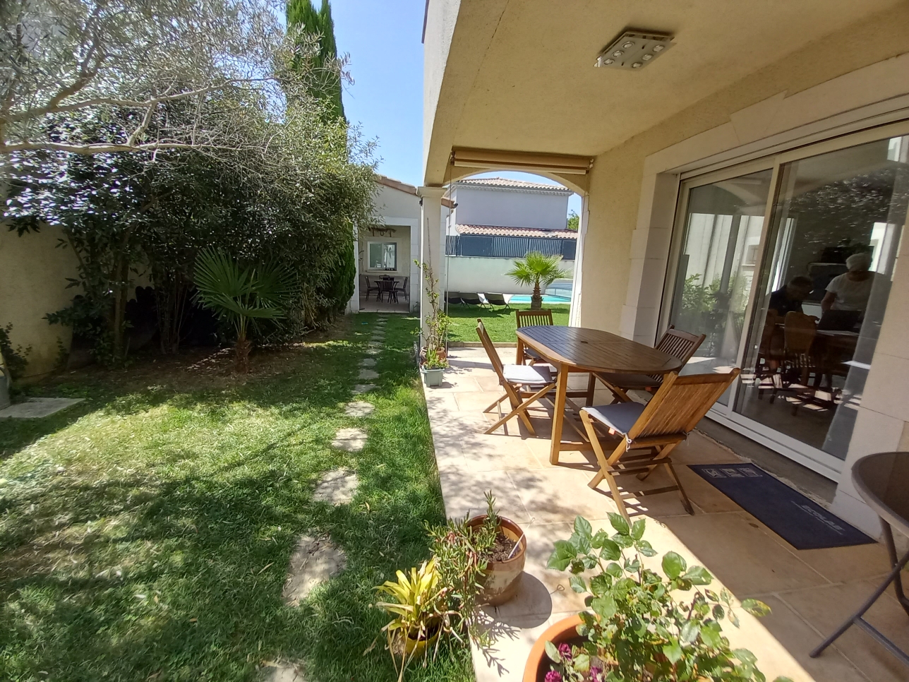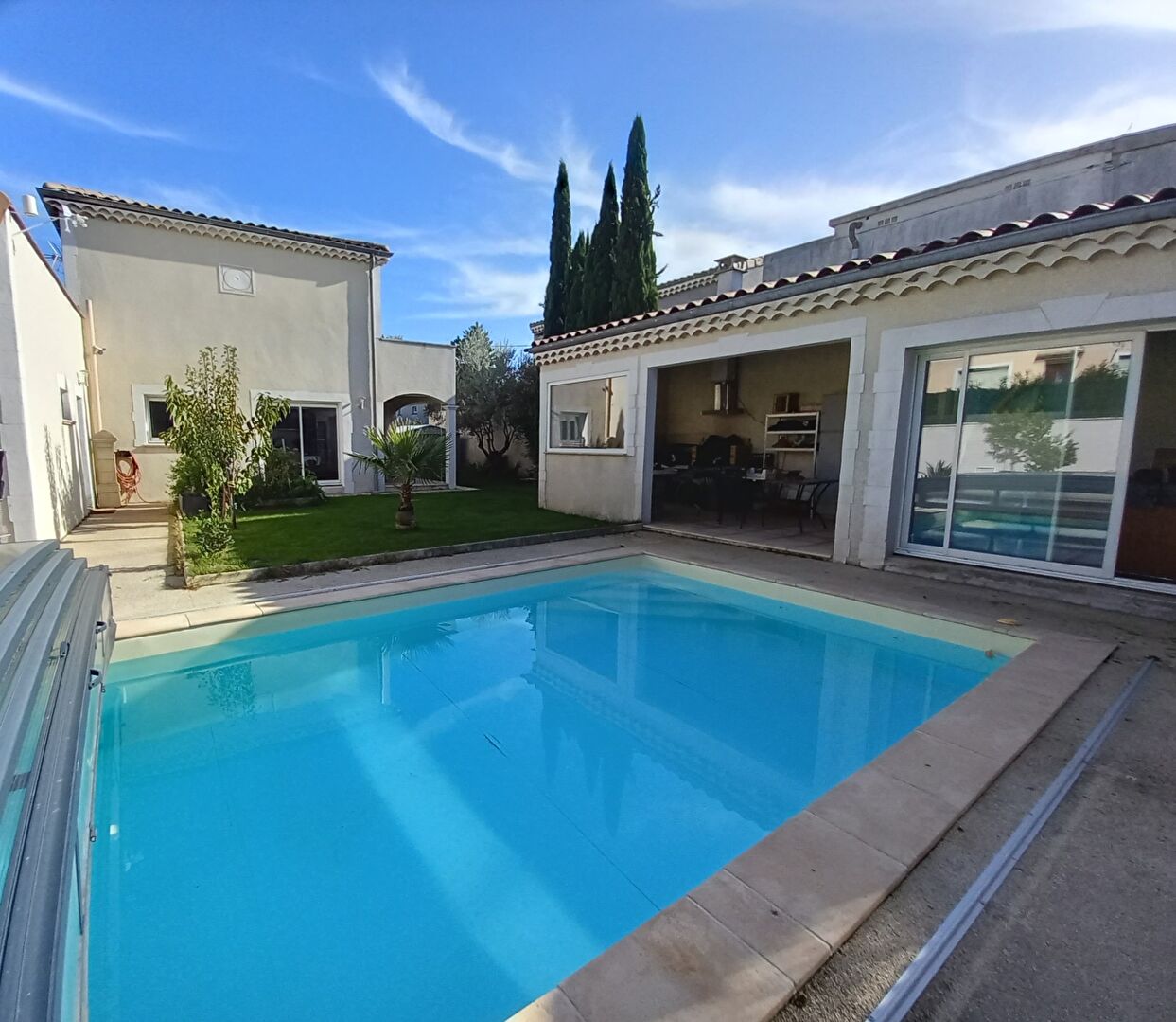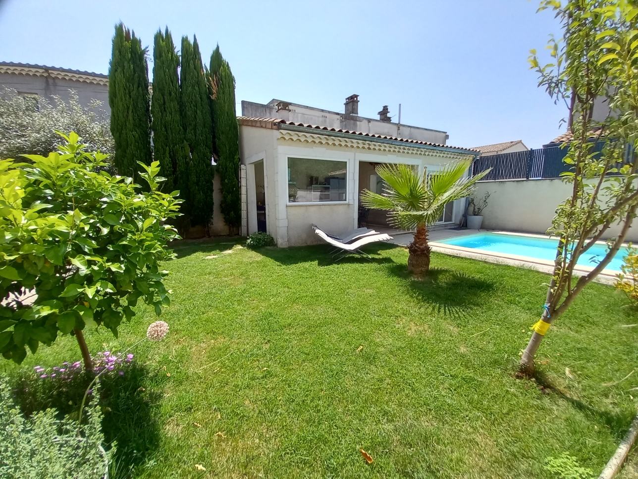 MAISON 5 PIÈCES AVEC BALCON - EN EXCELLENT ÉTAT GÉNÉRAL À vendre dans la ville de Montélimar (26200) : maison 5 pièces de 126 m² Carrez avec piscine. Cette maison de 5 pièces se compose comme suit : une entrée avec placard, un grand séjour/salon orienté plein sud de 45 m², une cuisine aménagée ouverte sur séjour donnant sur jardin, une chambre avec salle d'eau, un wc. A l'étage, 3 chambres ( 10 et 13 m²) avec placard, une avec accès à un balcon, une salle de bains et un dressing .Pompe à chaleur avec chauffage au sol réversible, climatisation. Piscine de 4 x 8 avec couverture et escalier, pool house avec cuisine d'été, jacuzzi, forage. Un garage (2 places), une terrasse couverte et un balcon complètent ce bien. A visiter ! Visite Virtuelle disponible