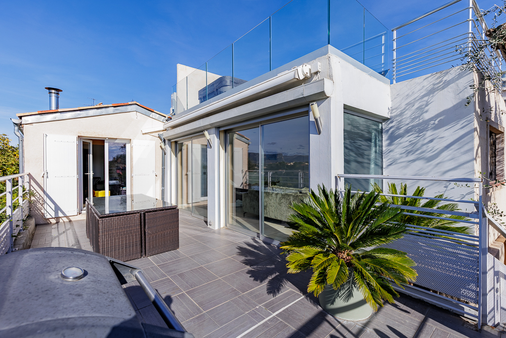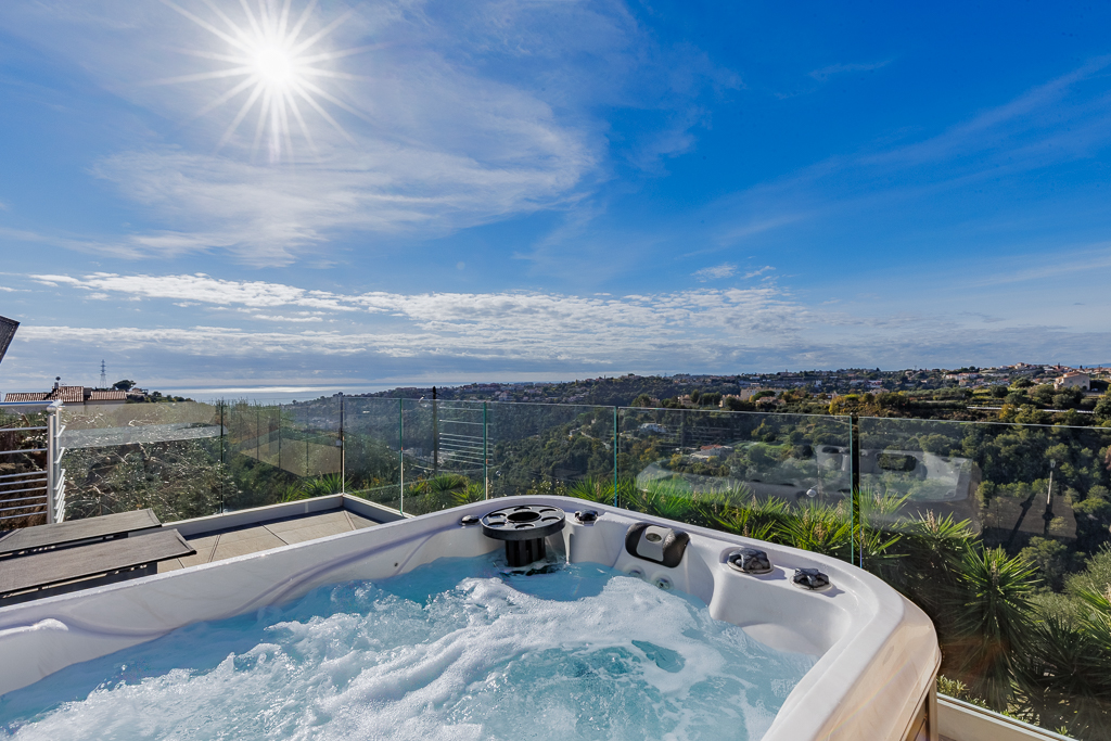 Sur le toit, une terrasse panoramique avec jacuzzi invite à la détente tout en profitant d'une vue dégagée sur la mer et les montagnes.