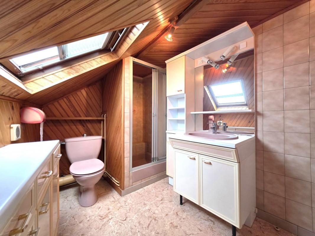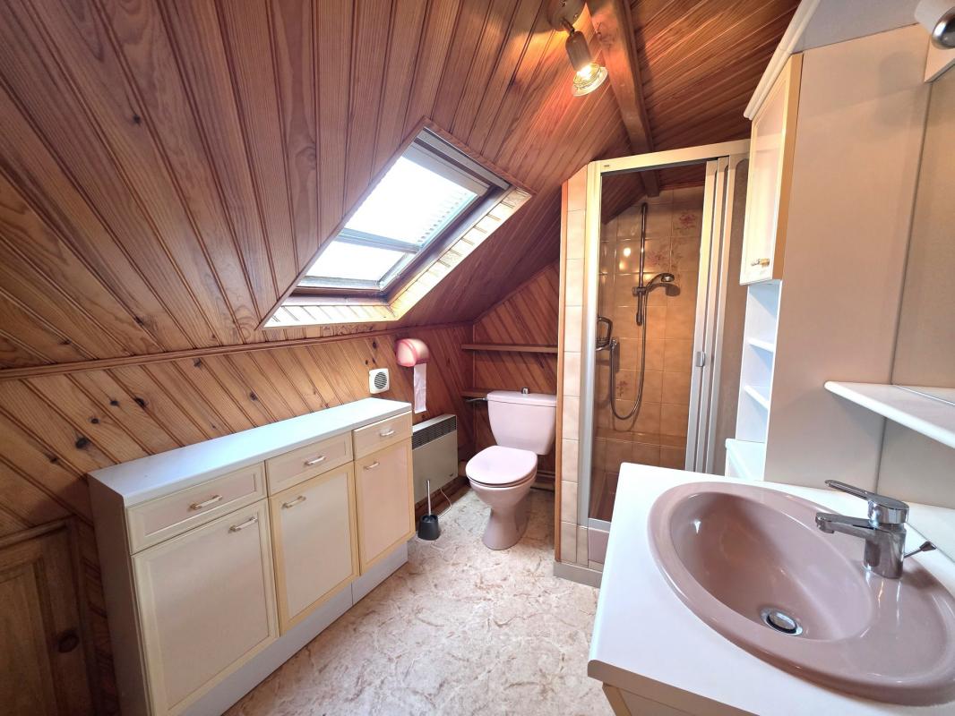 L'étage dessert un palier, une chambre lumineuse de 14m² avec parquet et une salle d'eau avec douche et WC.