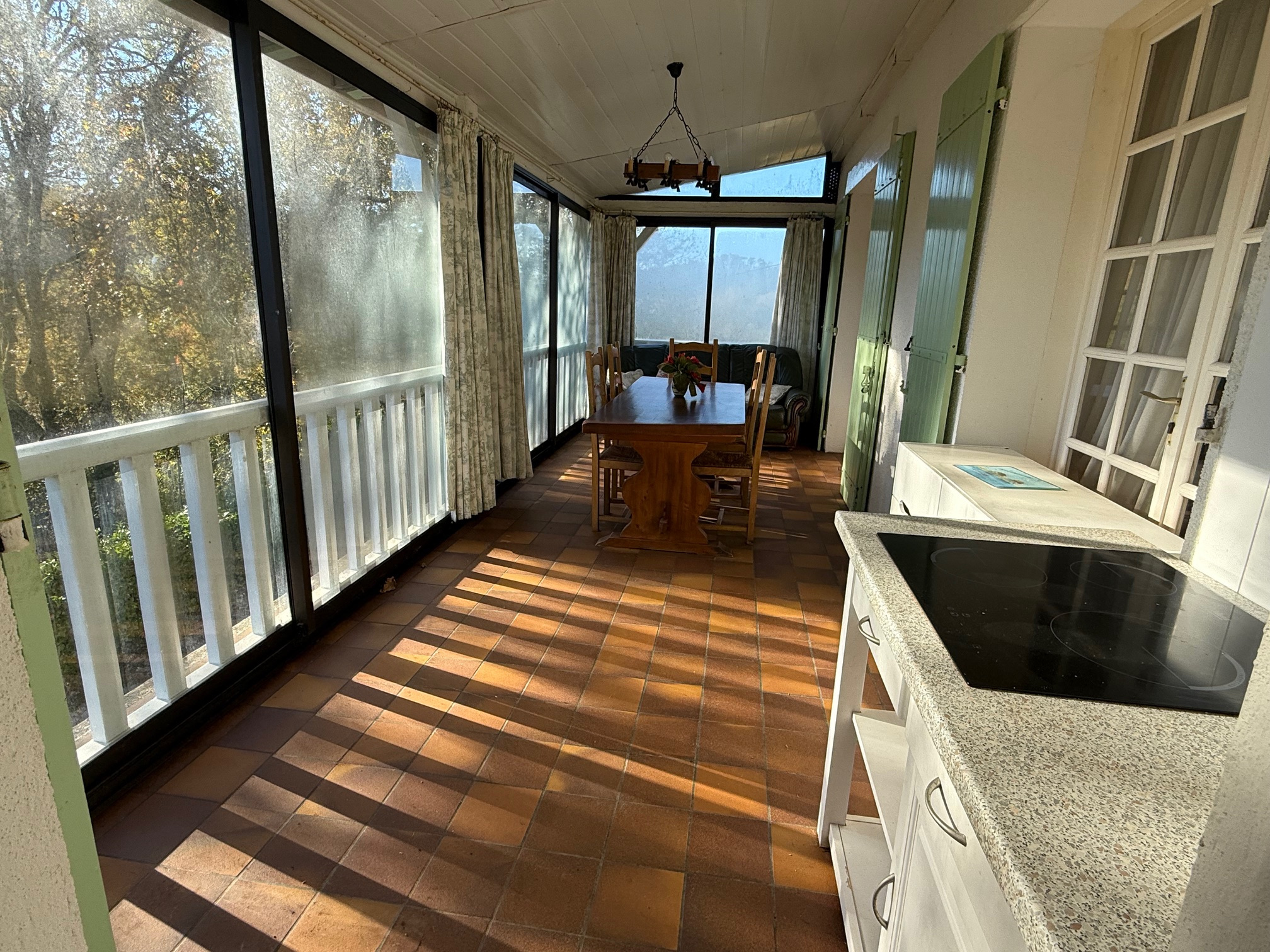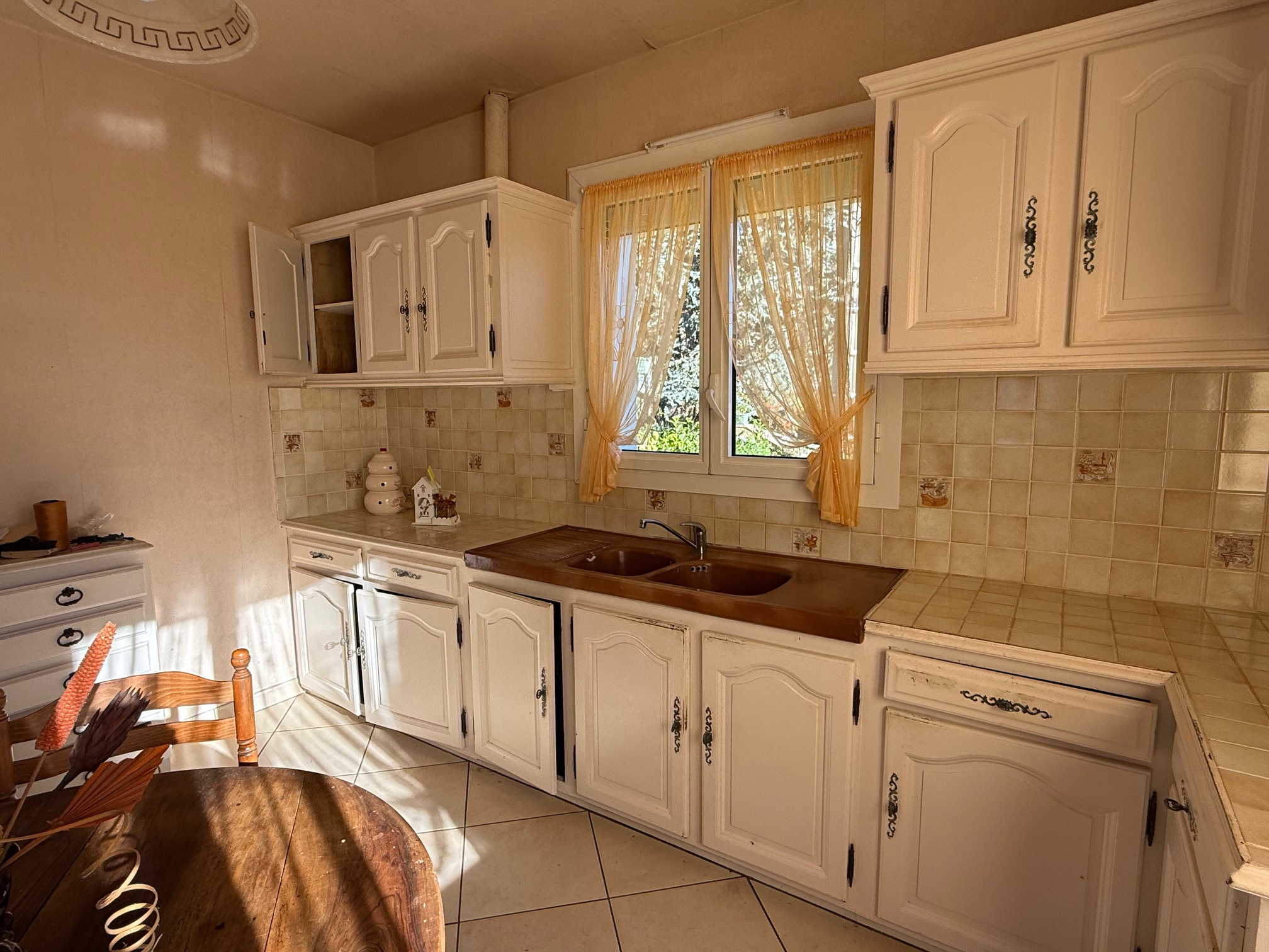. Elle est composée d'une entrée distribuant une cuisine aménagée sortant sur la véranda, d'un séjour et de 3 chambres dont une sortant sur le jardin, d'une salle de bain et d'un wc séparé, nombreux placards dans le couloir .Un escalier mène à un grand sous sol qui se partage en diverses pièces dont un garage, une buanderie, une chaufferie et un grand espace ouvert. Le tout est en bon état.