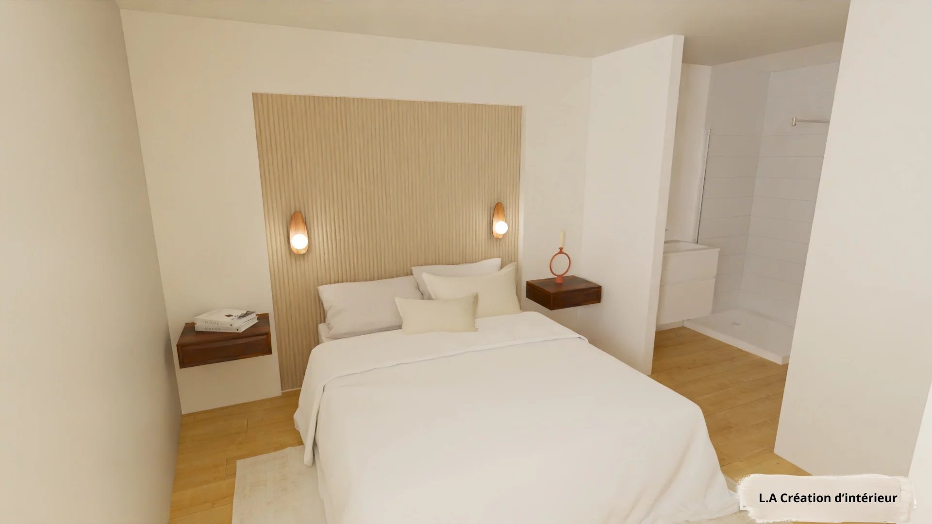 Une chambre de 11 m², avec un espace prévu pour un dressing, donnant accès à une salle d'eau équipée d’une douche, d’un meuble vasque et d’un sèche-serviette.