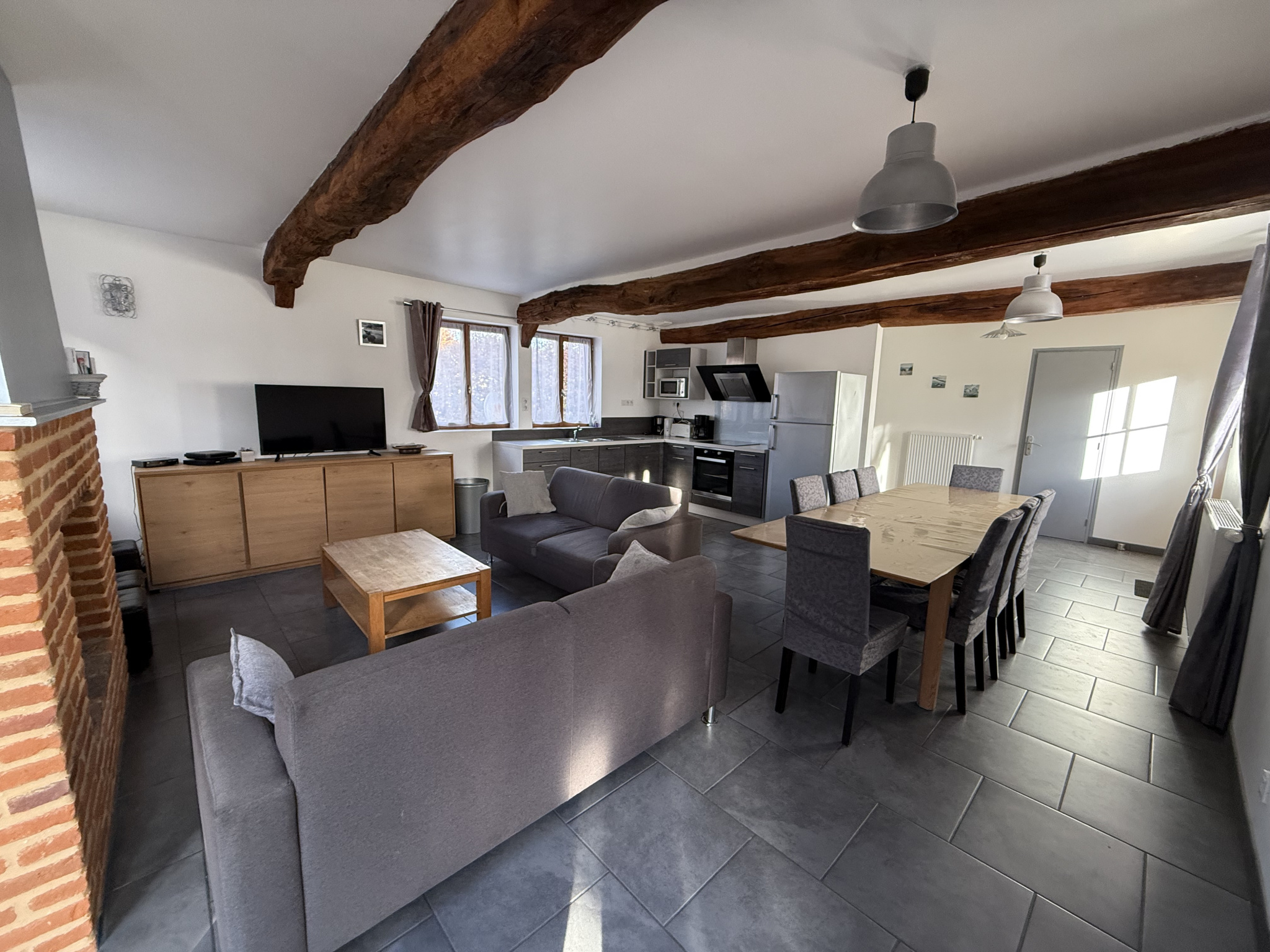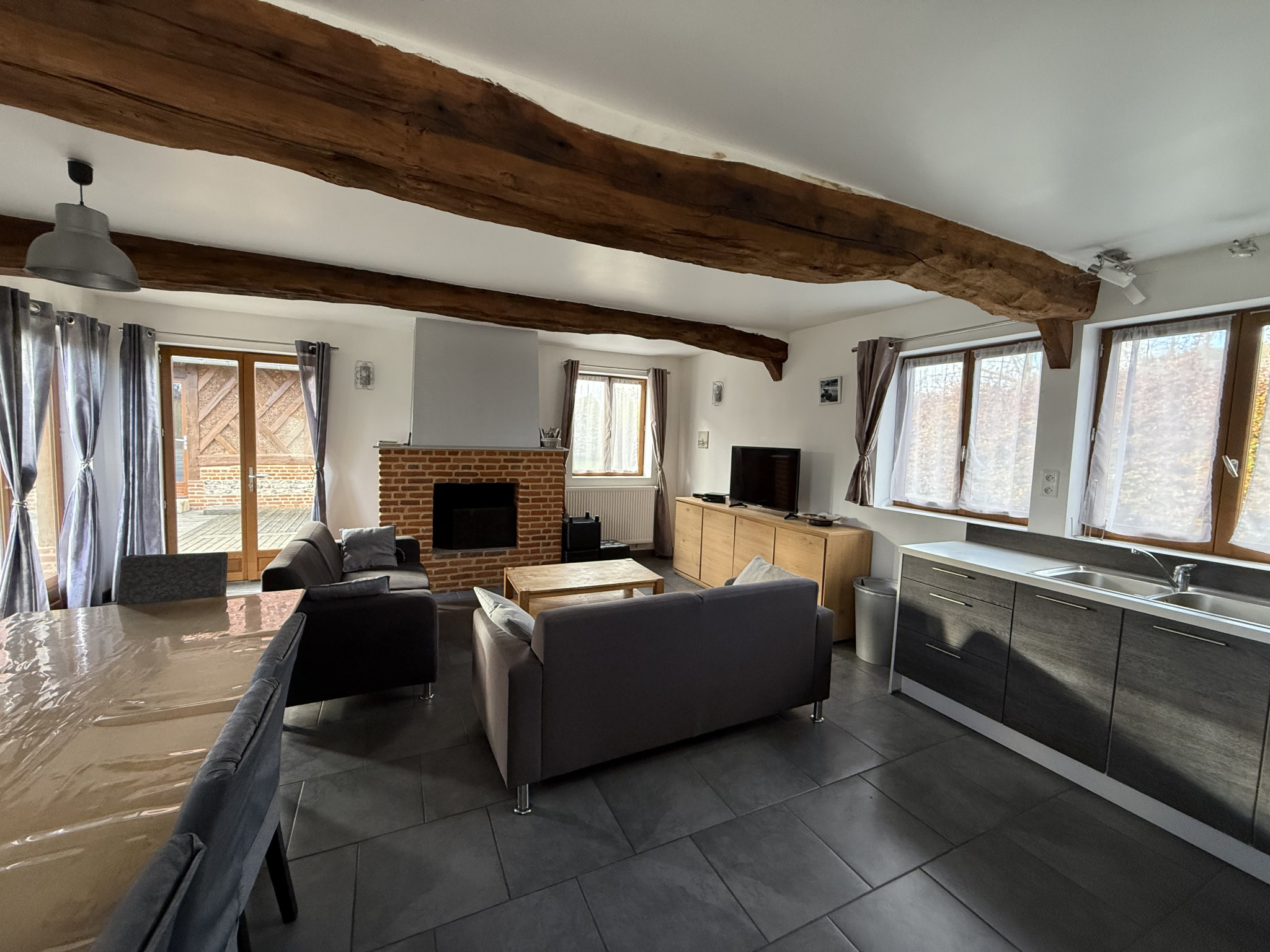 La pièce de vie centrale est chaleureuse avec ses poutres et sa cheminée traditionnelle en brique.
