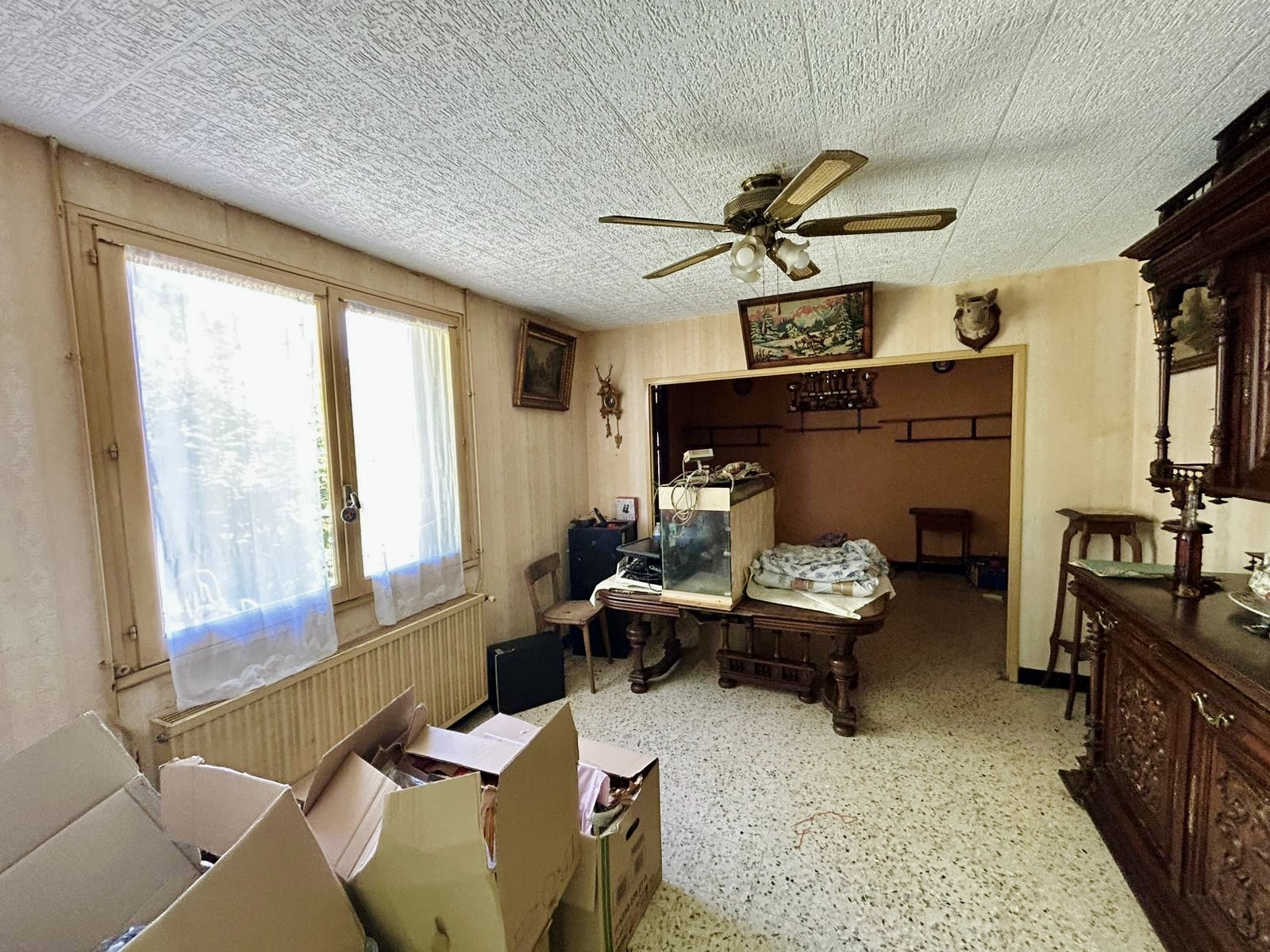 Située à 5 minutes de Villeneuve, sur un terrain de 800 m2, cette maison de plain-pied construite en 1980 offre 80 m2 habitables. Elle comprend un salon de 22 m2 avec accès au jardin, une cuisine séparée, deux chambres, un bureau et une salle de bain. Un cellier ainsi qu'un atelier attenant de 20 m2 complètent l'ensemble. Le chauffage est assuré par une pompe à chaleur air/eau installée en 2023, et les combles ont été isolés. Des travaux sont à prévoir : menuiseries, rafraîchissement, électricité et raccordement au tout-à-l'égout. La performance énergétique est excellente en l'état (DPE C).