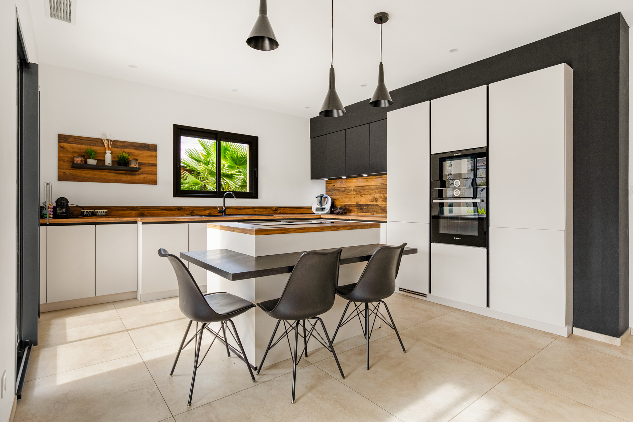 La maison bénéficie de prestations haut de gamme : climatisation gainable intégrée, menuiseries aluminium, borne de recharge pour véhicule électrique, panneaux solaires pour une meilleure performance énergétique, et des finitions soignées dans chaque espace.