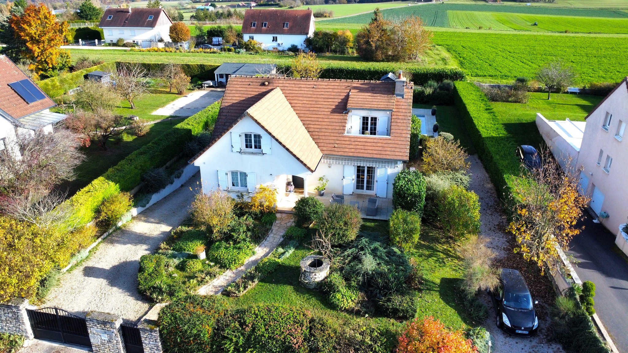 Dijon Nord Valmy, à Marsannay le bois. Jolie maison familiale sur sous sol complet comprenant au rdc, salon séjour ouvert sur la cuisine entièrement équipée et donnant sur une vaste terrasse couverte, deux chambres, une salle de bain, un WC séparé. A l'étage, une mezzanine pouvant faire office de bureau, trois chambres dont une avec terrasse tropézienne offrant une magnifique vue dégagée, salle de bain et WC. Son jardin de plus de 1500 m2 entièrement clos et joliment arboré accueille une piscine chauffée 9,5 x 4,5 m et son emplacement dans un village bénéficiant de nombreuses commodités (écoles, commerce, maison médicale) sauront vous séduire - DPE : C - Prix : 445 000 Euros - Honoraires charge vendeur - Contact : 03 80 41 55 06