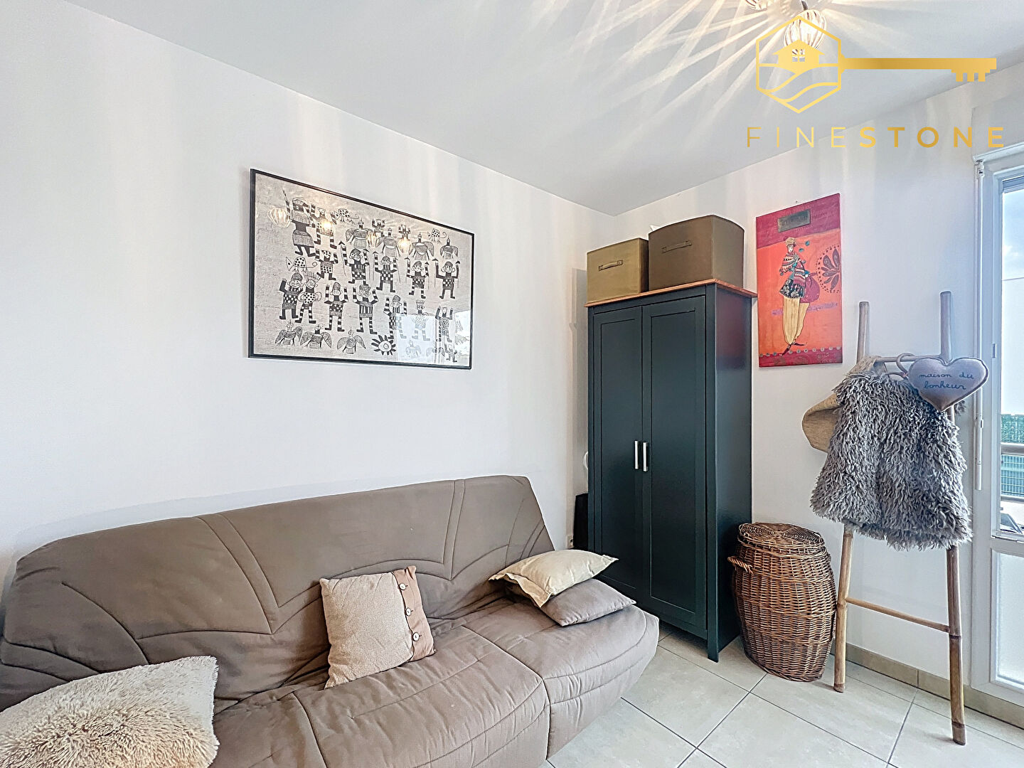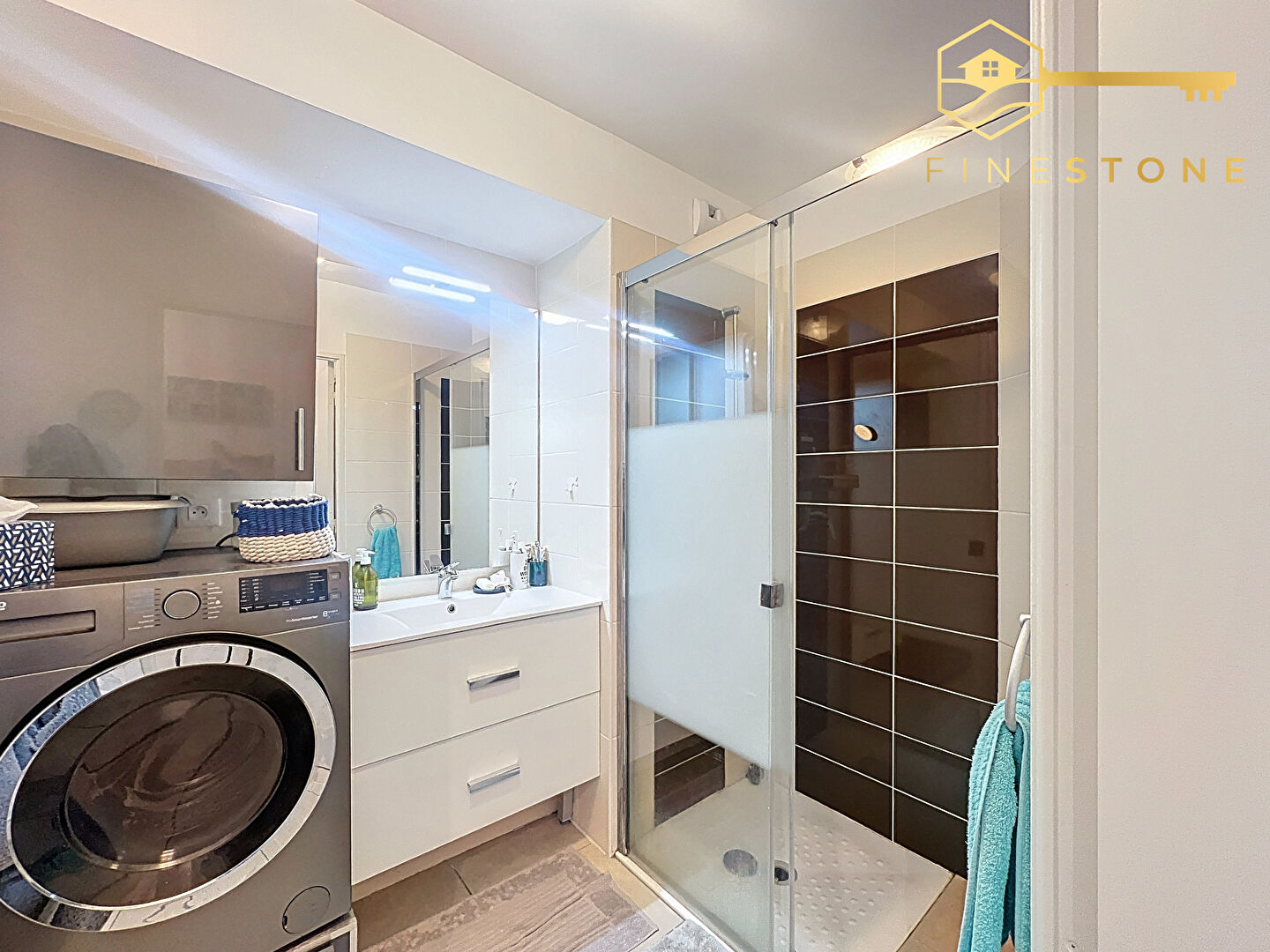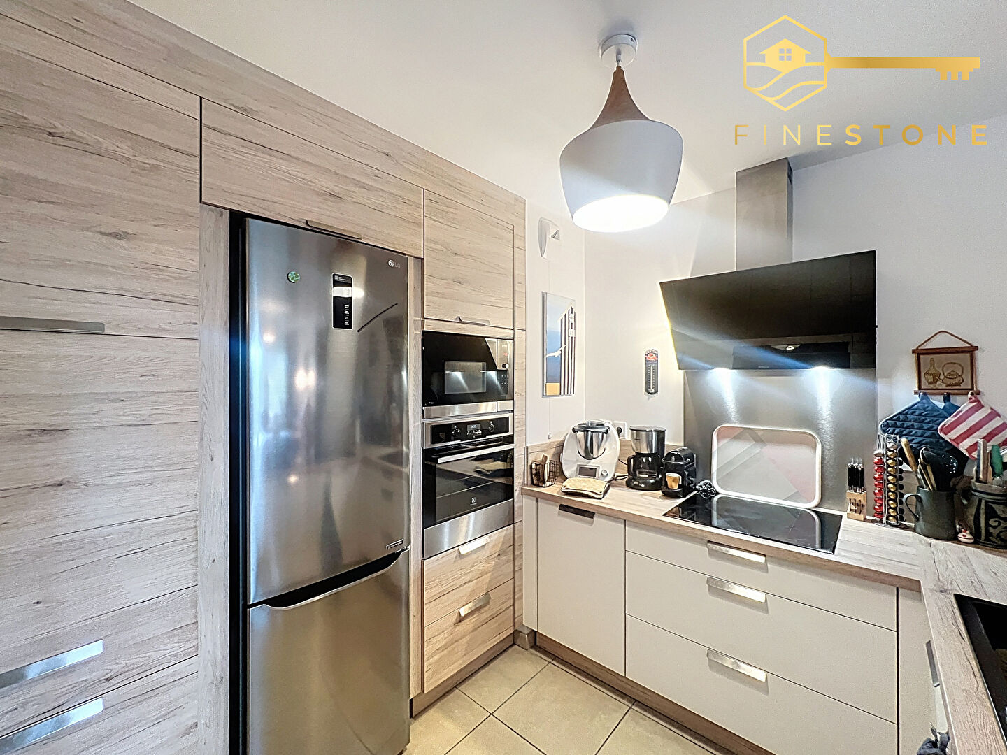 L'intérieur comprend une cuisine américaine aménagée et équipée, un séjour spacieux de 22 m², ainsi qu'une salle d'eau moderne et un WC indépendant . L'entrée propose une hall avec placard aménagé. L'appartement est climatisé !