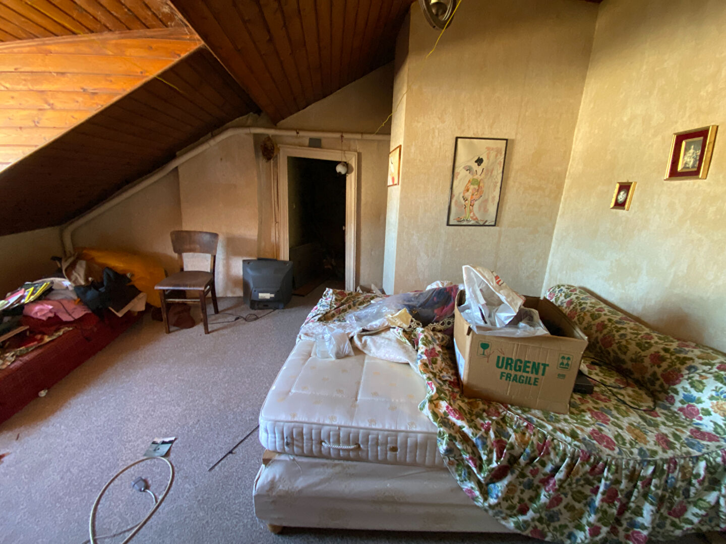 Immeuble comprenant un local commercial 32m², wc. A l'étage : appartement comprenant : entrée, séjour, cuisine, chambre, salle de bains, wc. 2ème étage : chambre avec point d'eau et grenier. Cave sous l'immeuble. Chauffage central gaz de ville.