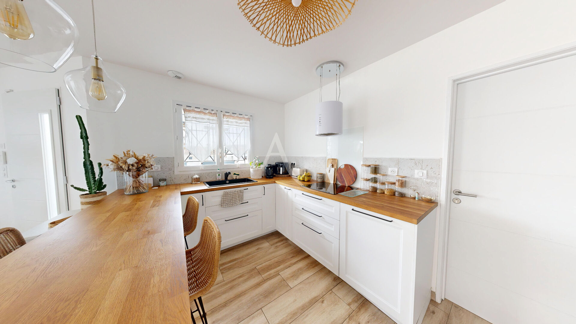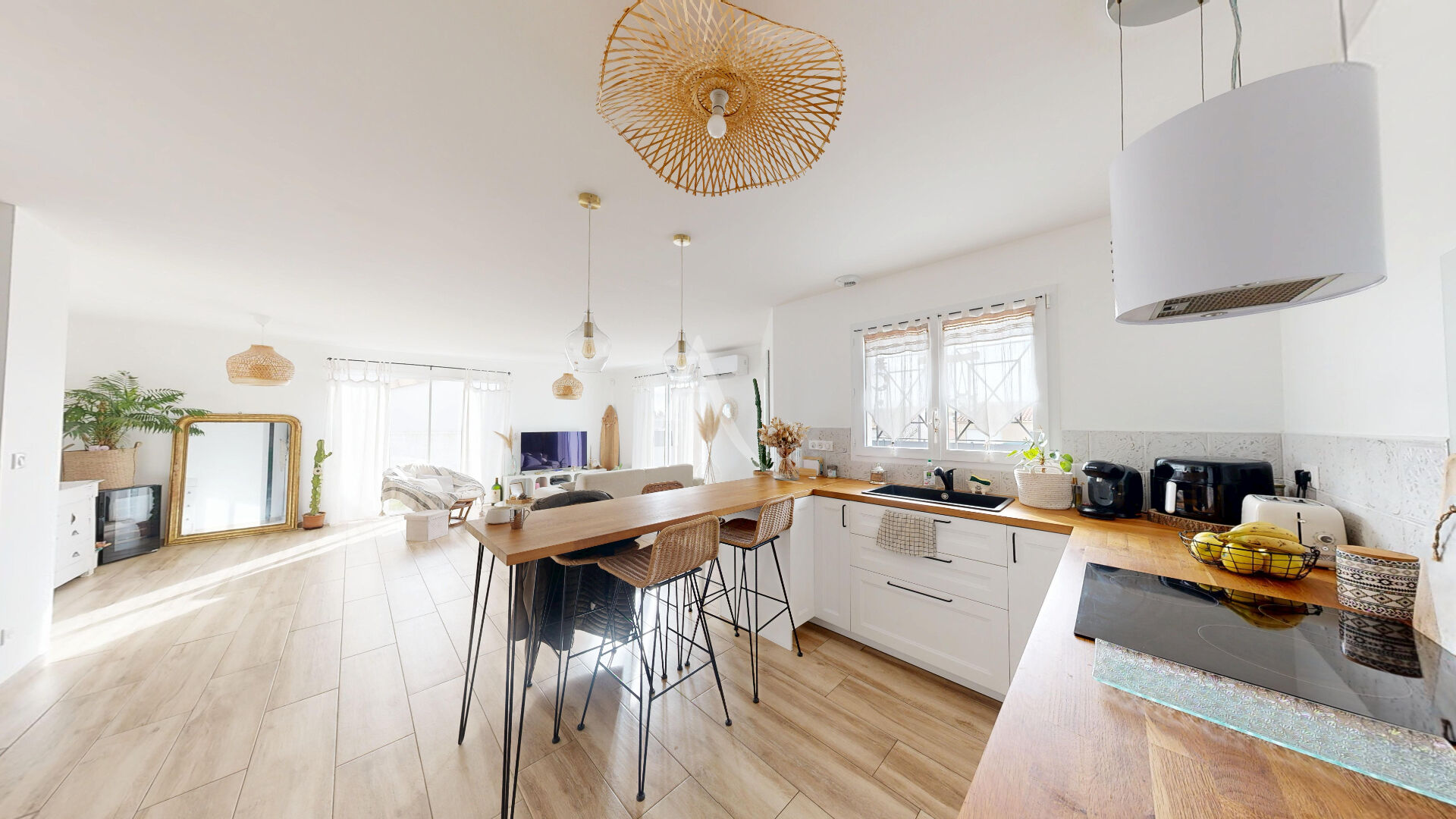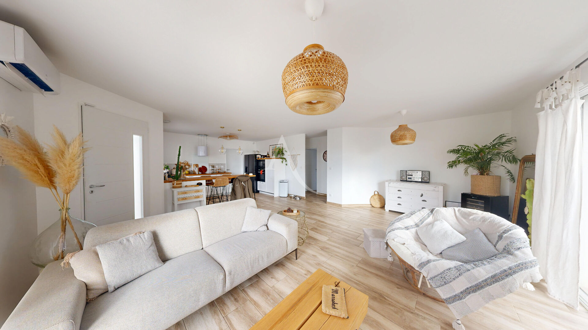 L'espace salon, accueillant et spacieux, s'ouvre sur une cuisine américaine aménagée et équipée, moderne et fonctionnelle : plan de travail généreux, nombreux rangements, électroménager complet, un véritable espace convivial pour recevoir famille et amis autour d'un bon repas.