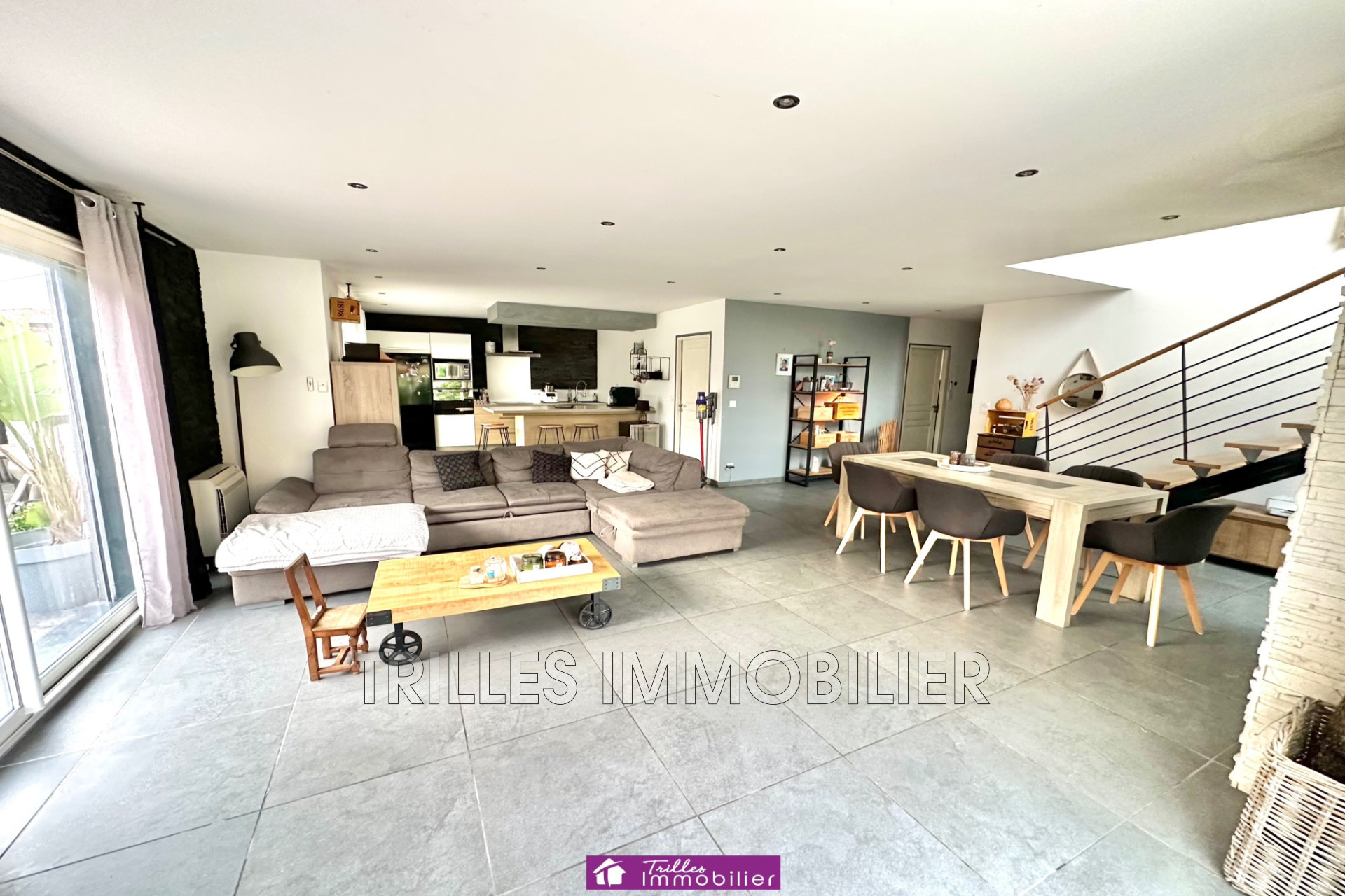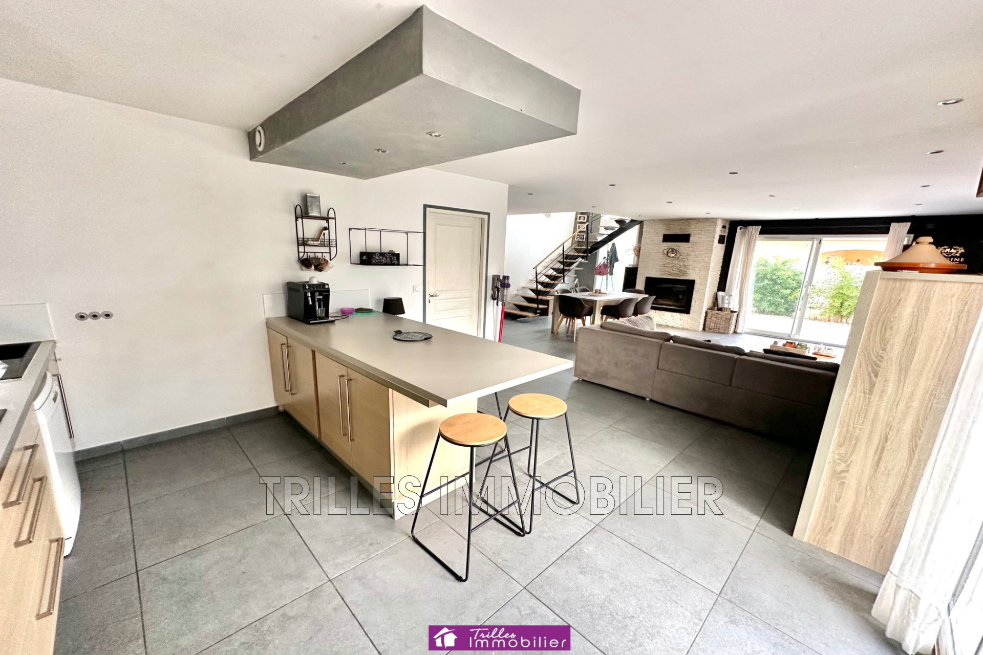 Au rez-de-chaussée, vous découvrirez un vaste séjour traversant avec cuisine ouverte, baigné de lumière grâce à ses grandes ouvertures donnant accès direct aux terrasses et à la piscine.