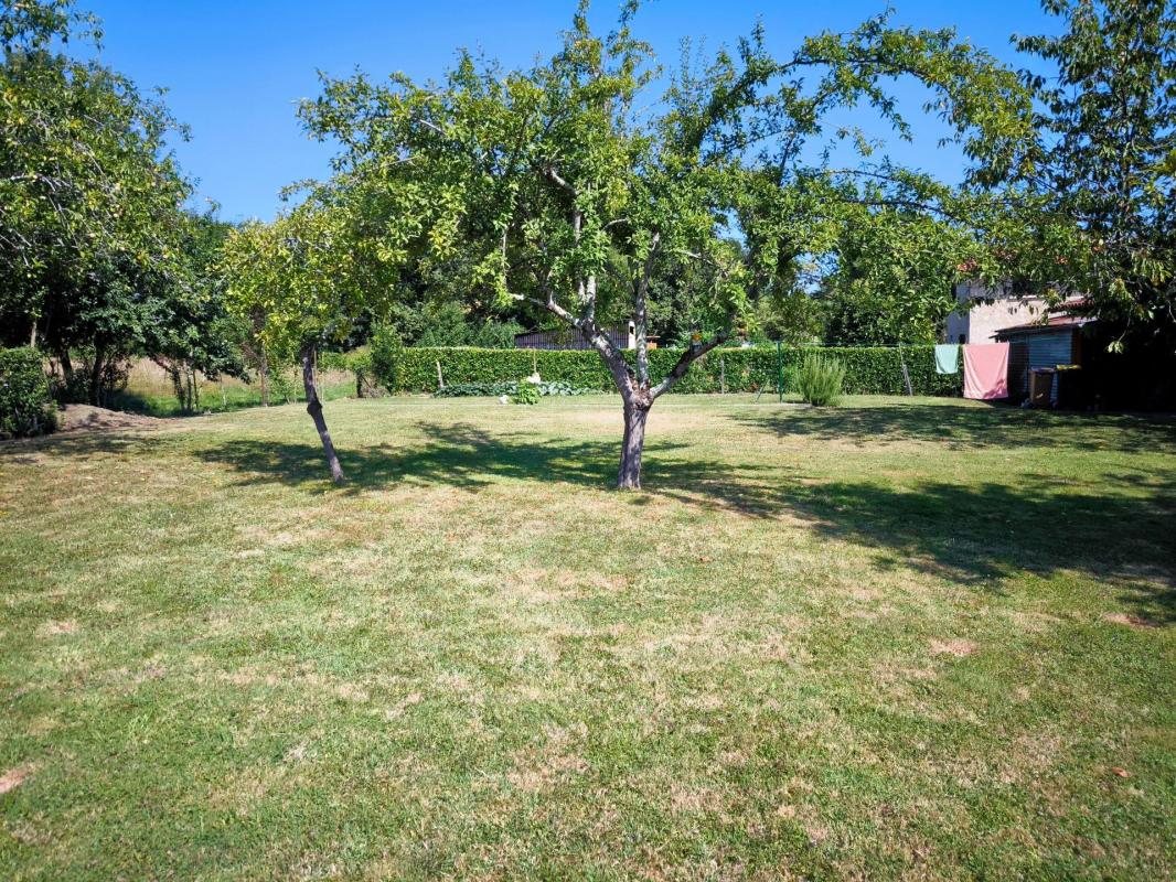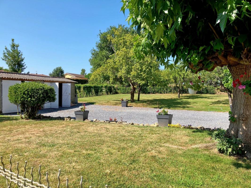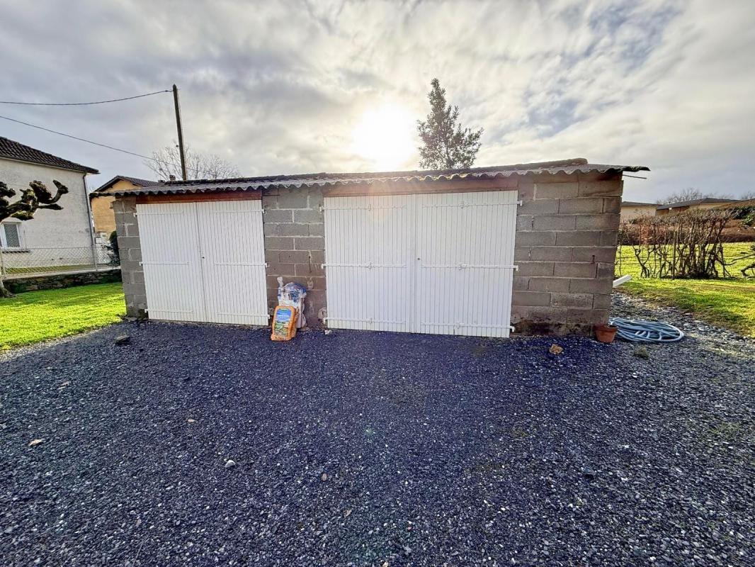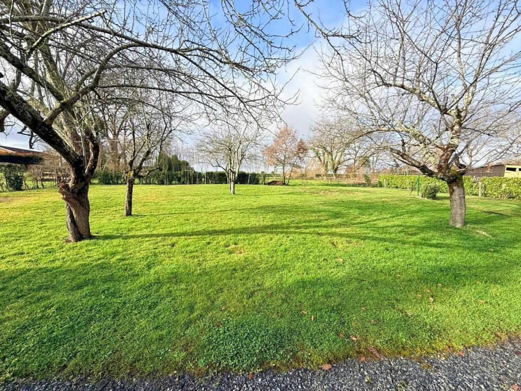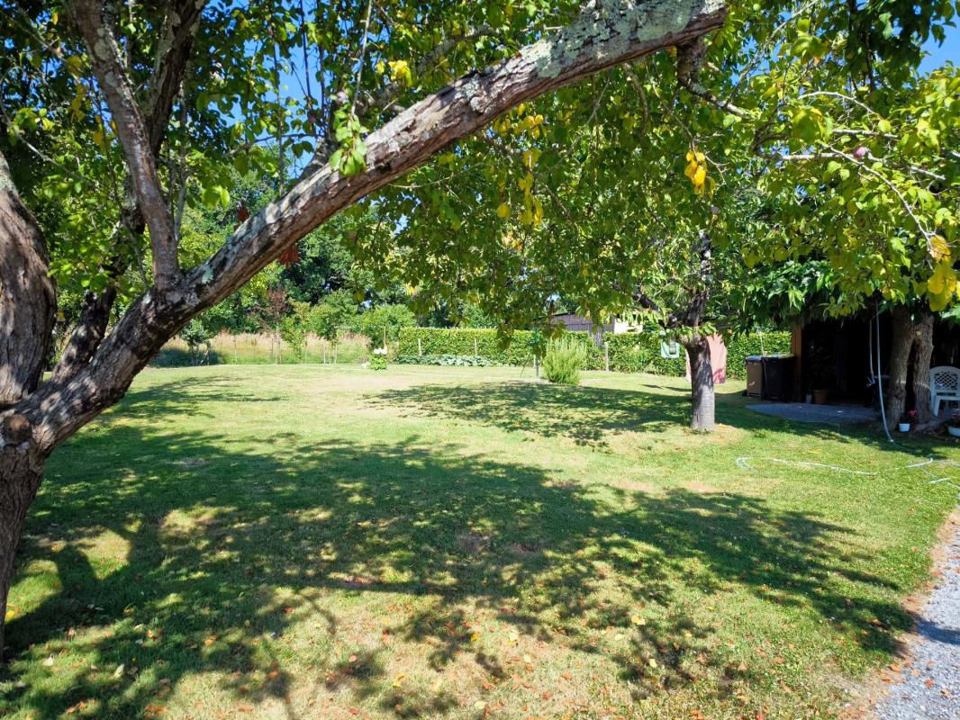 En face de la maison, un double garage offre un stationnement confortable. Le jardin, arboré et entièrement clos, s'étend sur 1 200 m² : un véritable atout pour les amoureux de la nature ou les propriétaires d'animaux.