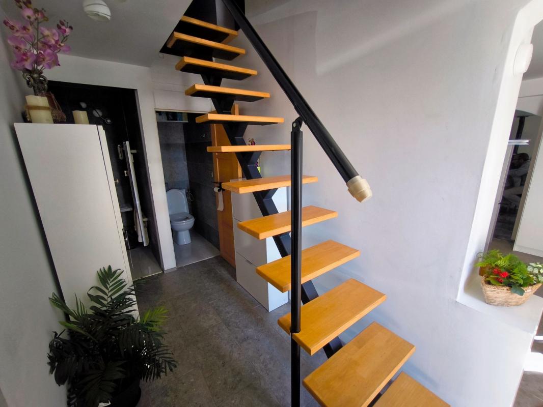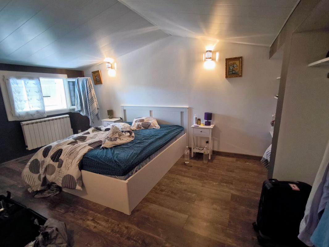 Maison entièrement rénovée comprenant, de plain-pied, un salon, une cuisine, une chambre, des WC séparés et une douche à l'italienne. À l'étage, une seconde chambre complète l'espace nuit.