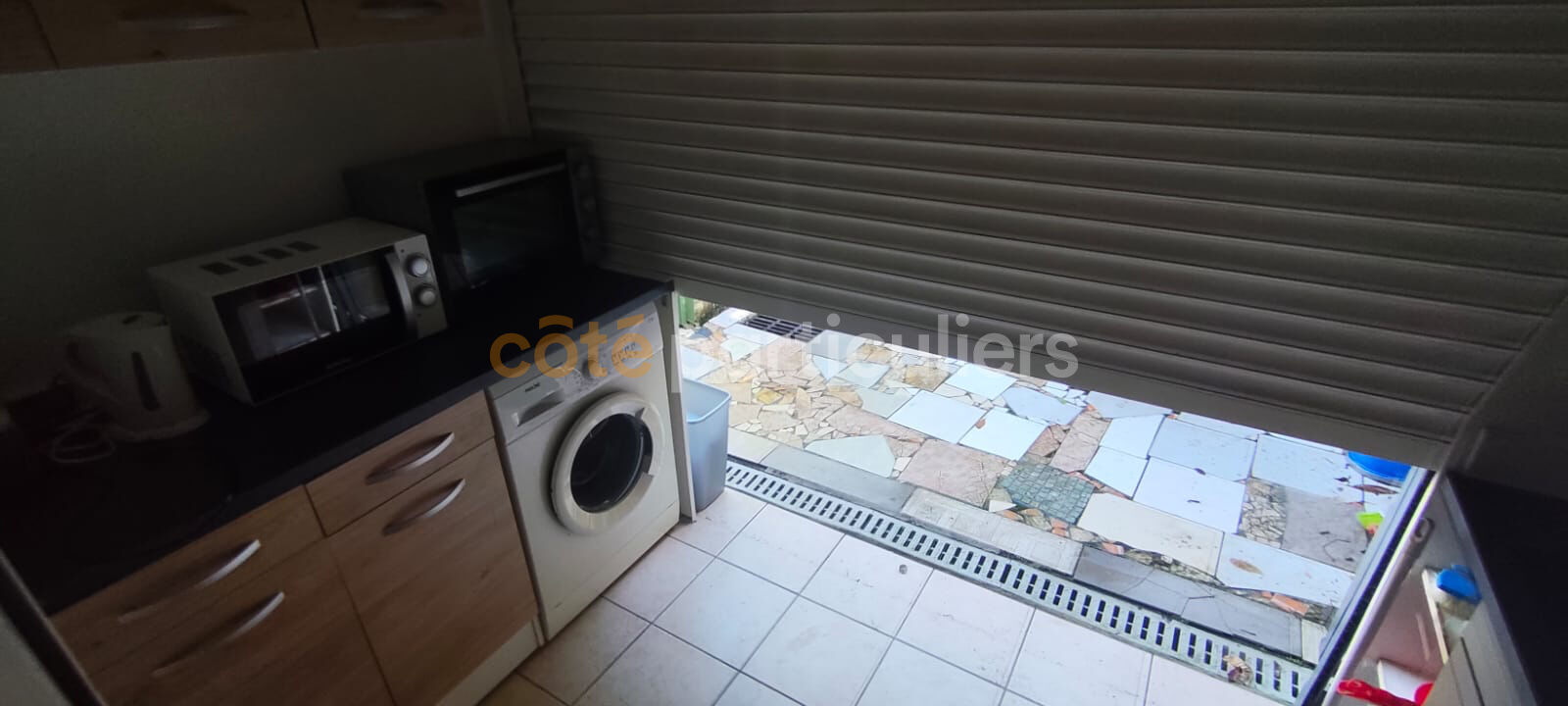 Un petit vestibule, une Chambre avec rangement, un petit salon, une salle d'eau avec cabine de douche et WC, une cuisine couverte s'ouvrant sur une cour clôturée de 25m2