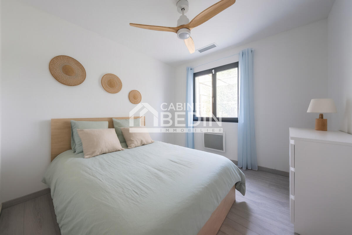 L?entrée s?ouvre sur une spacieuse pièce de vie baignée de lumière, avec cuisine ouverte moderne, donnant de plain-pied sur une terrasse ensoleillée et un jardin intimiste.