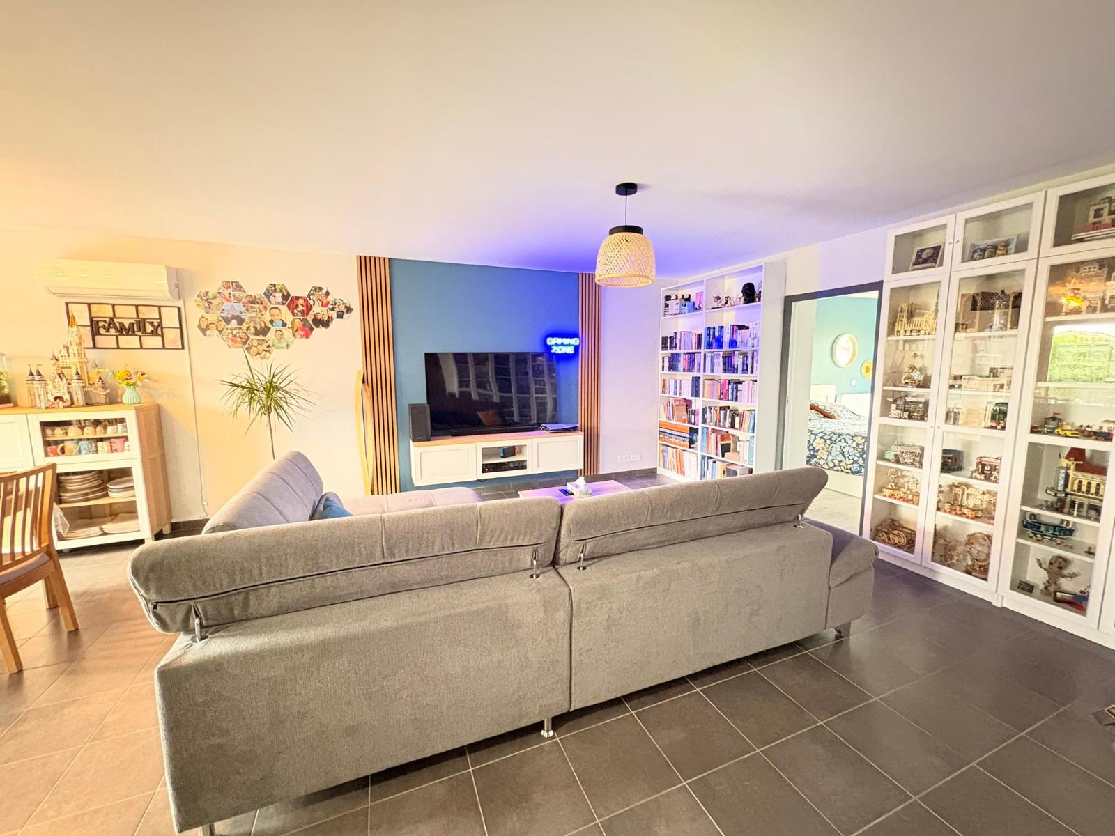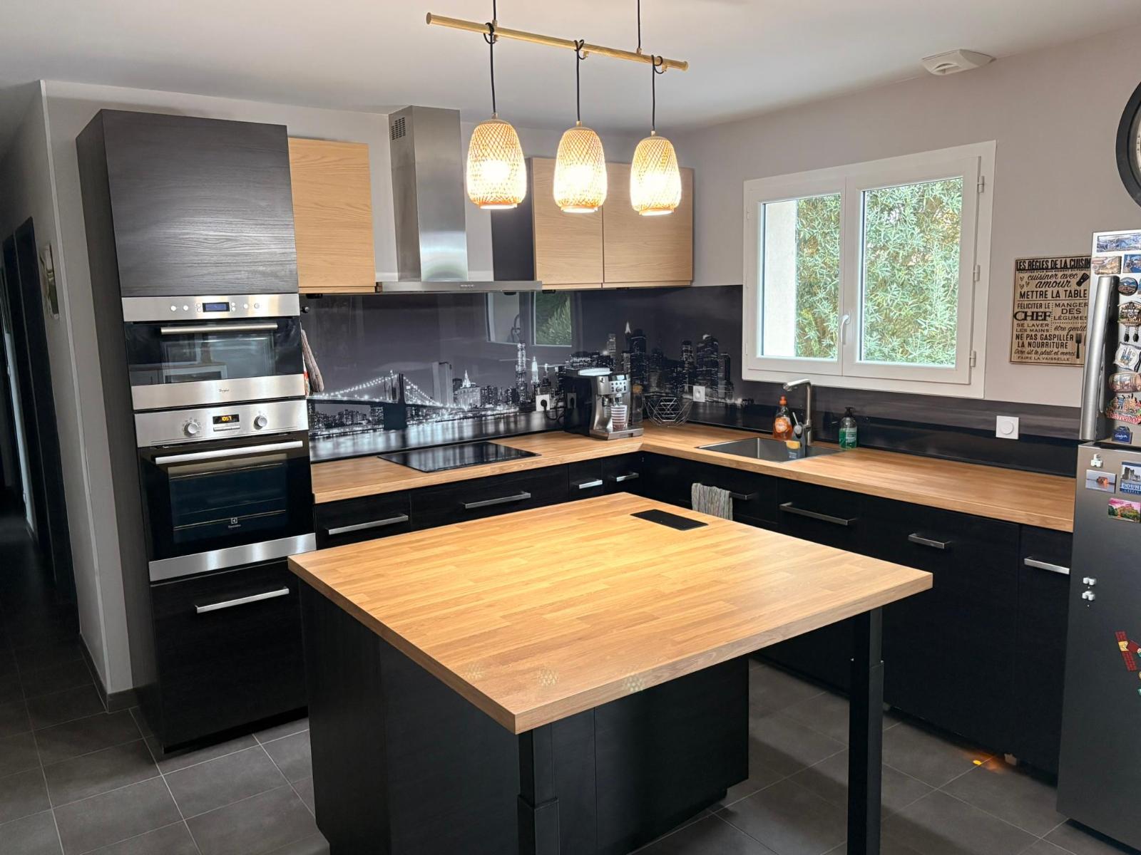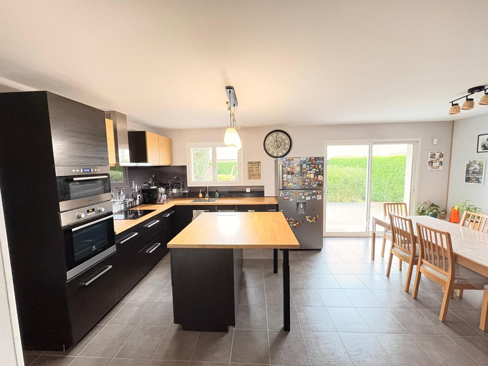 La cuisine aménagée, sublimée par un îlot central, s'ouvre sur un grand séjour bien agencé. Ce vaste lieu de vie invite autant aux moments en famille qu'aux réceptions conviviales.